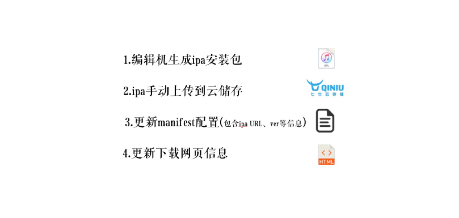 我们的 iOS 开发团队,每天都会发布多个 ipa 测试安装包,由于 iOS 安装限制,需要把这个 ipa 文件上传到七牛上面,然后手动更新一个线上的 xml 文件(里面含有当前版本号、线上的ipa 安装包地址)之列的动态信息,然后再把这个 xml 文件发布到线上。