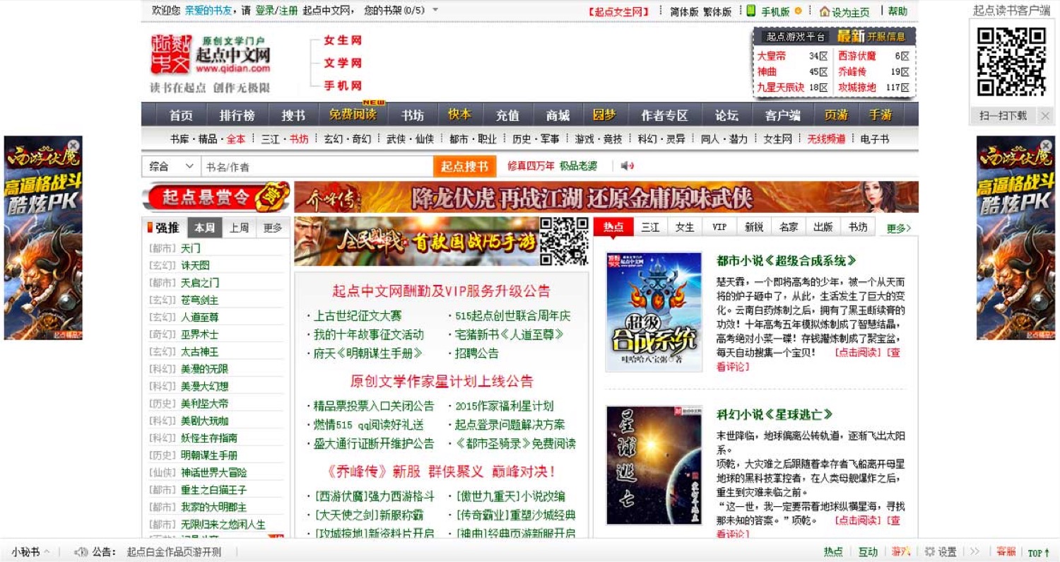 上面这张图这是改版前的起点中文网,UI十分复古,后端是Java,前端团队只负责重构,然后把 HTML 交付给后端套模板。在这种开发模式下,前端团队没有太大的话语权,在公司里的定位就是「切图」,考验前端团队的标准,也仅仅局限在完成网页数量、视觉还原度。前端开发者,在这种情况下,各自为战,有人纯手写代码,有人用 Less,有人用 Sass,有人用四个空格,有人用一个Tab,并没有一套统一的开发规范和代码规范,也没有相应的工具来保证交付质量,就更别谈什么前端性能指标了。