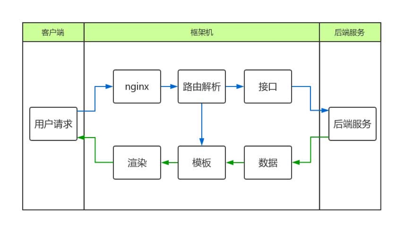 Client 请求对应的路由,Nginx层将用户请求转发到框架机,框架机根据请求头 Header 中的 Host 和路由信息,请求配置文件中配置的对应后端接口,找到对应的模板文件,最终渲染出 HTML 返回给Client。