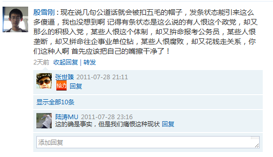 对不起了,这位名叫”殷雪刚“的同学,实在不好意思,我这篇文章未经你同意就po上了你的三条人人网状态,不像我一贯作风,我并没有马赛格你的头像,写这篇文章的时候,你的刚毅的眼神一直盯着我,令我始终保持警惕,逼迫我不断提醒自己:这篇文章要虽不能保证公正,但是只至少要客观。
