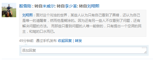 “有人恨这个政党,却又那么的积极入党,某些人恨这个体制,却又拚命报考公务员,某些人恨垄断,却又拼命往企事业单位钻,某些人恨腐败,却又花钱走关系,你们这种人啊 首先应该把自己的嘴擦干净了!”