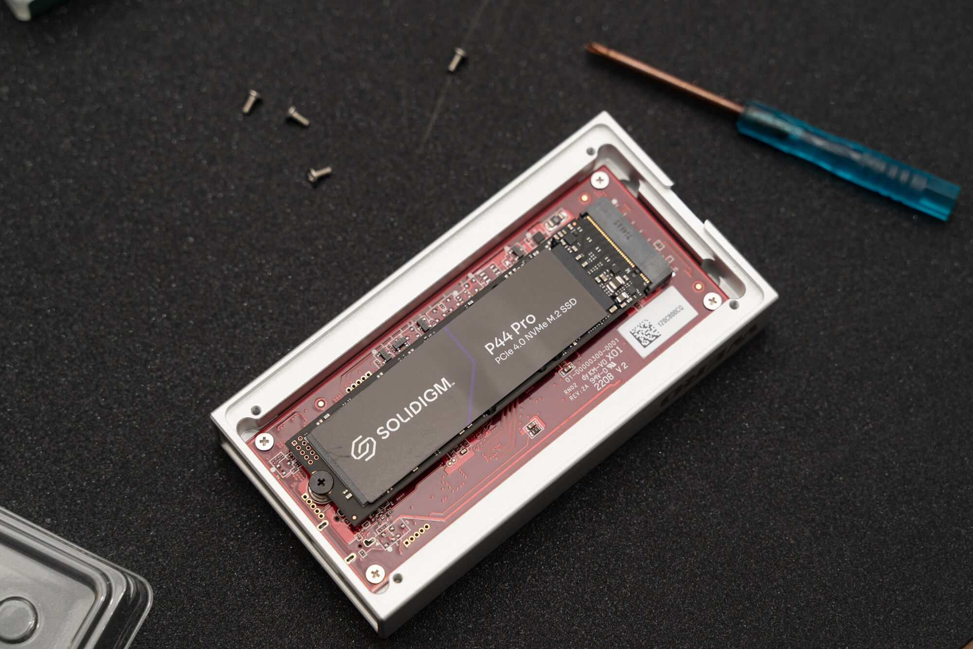 这就是今天的配件主角,WERO 的雷电硬盘盒和海力士 Solidigm P44 Pro 。现在 SSD 价格极其优惠,虽然甚至不到 600 就能买到国产的高速固态硬盘,但是由于我是打算给 Mac mini 用作系统盘,所以比较看着稳定性和质量,海力士这块 P44 Pro 算是第一梯队的高档产品,也不便宜。