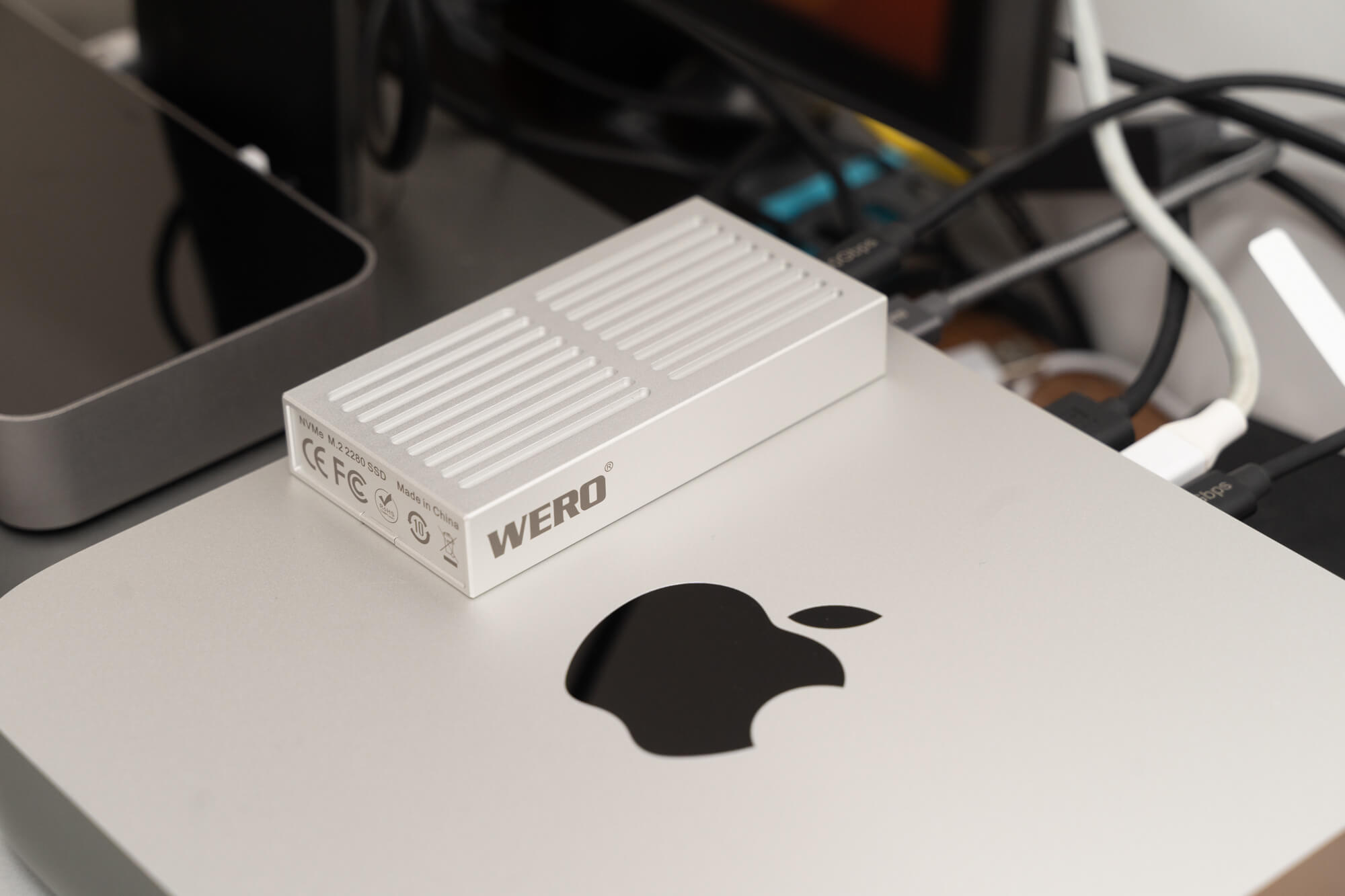 安装好后,将盒子连接到 Mac mini 背面靠近 HDMI 的雷雳 4 接口,就可以跑满速度了。WERO 这个盒子我看评价说颜值在线,实际观感还可以,我买的雾面银色。