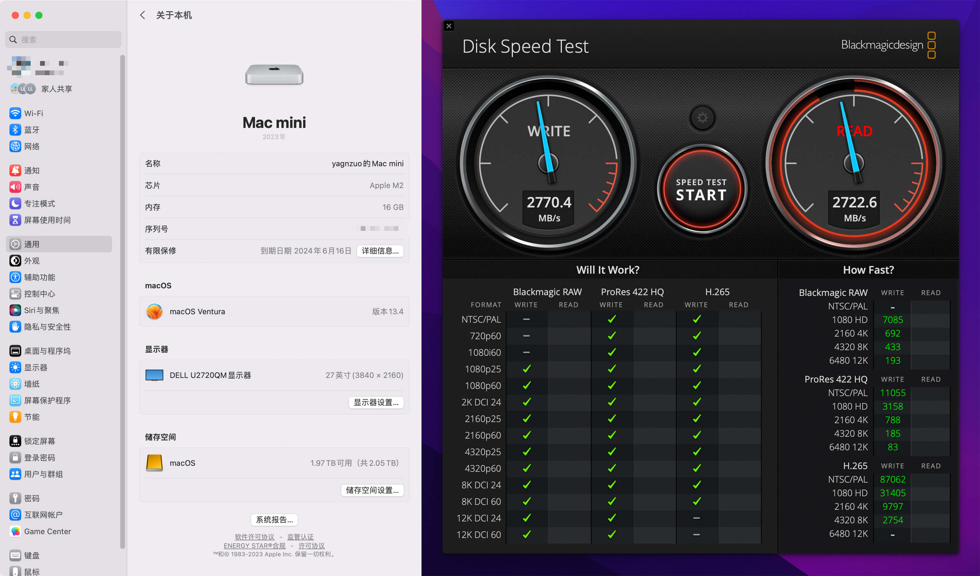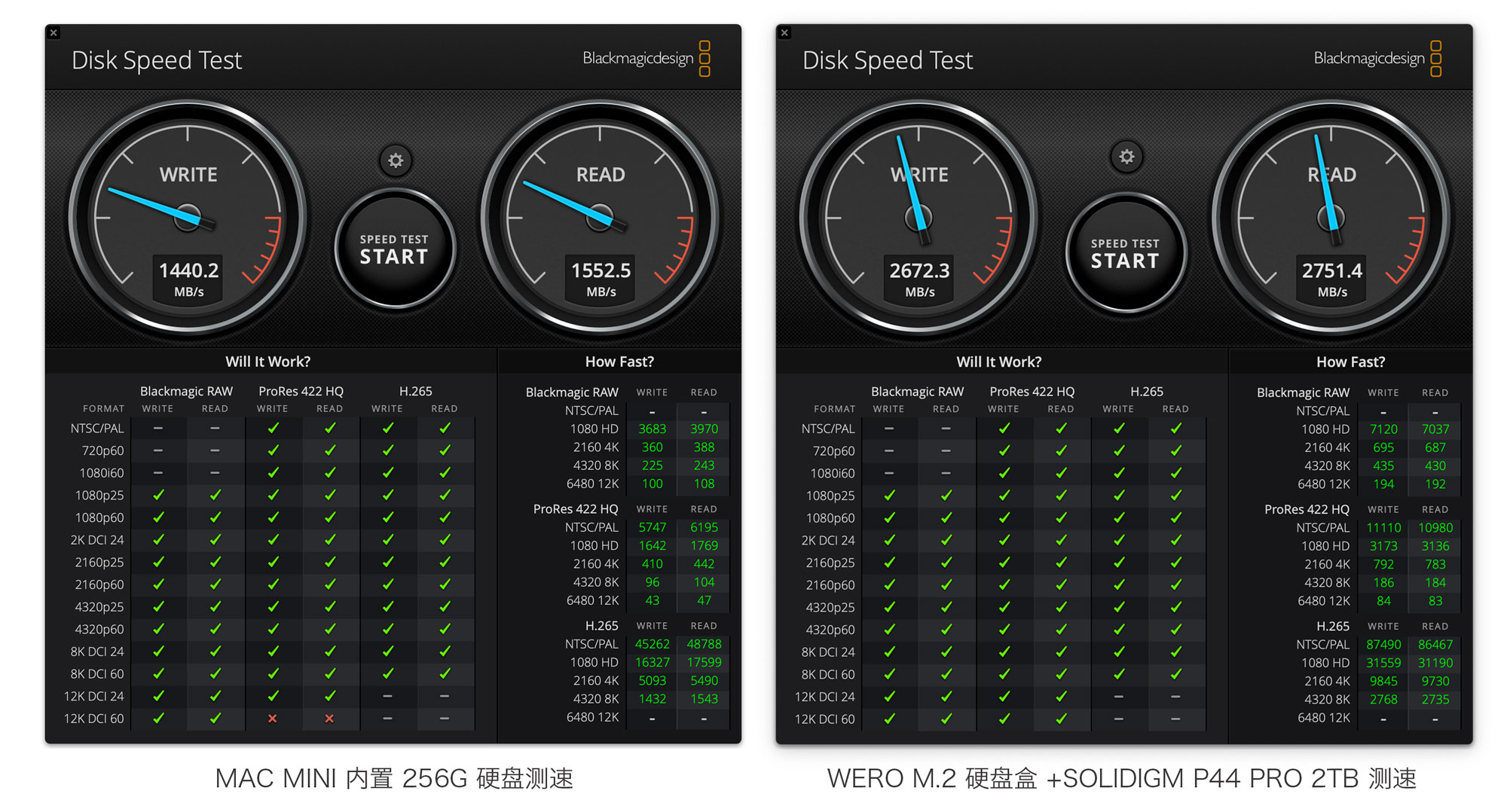 再放一张 mini 内置自带 256GB 和外接 2TB 硬盘的读写速度对比。