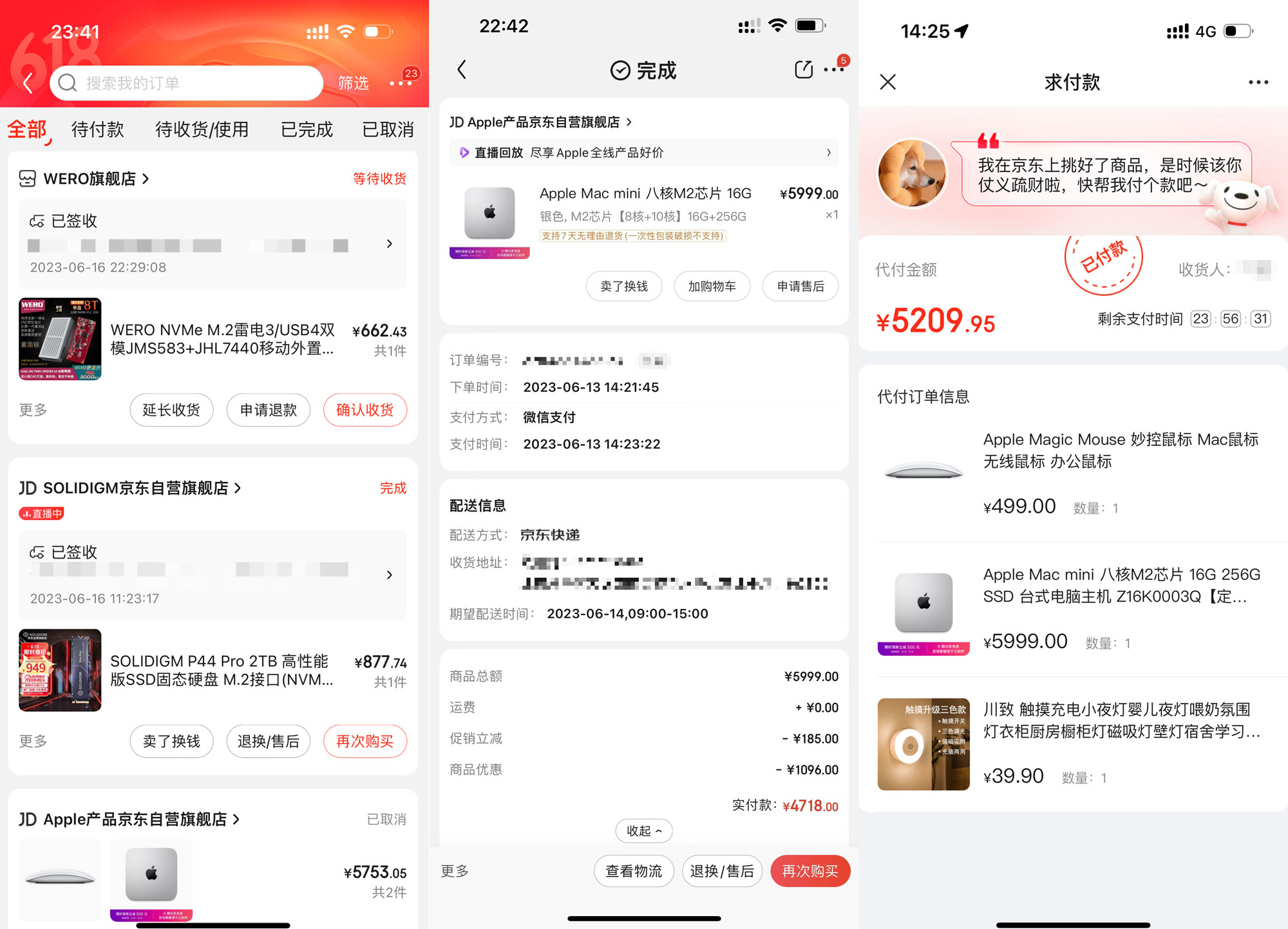 除了 Mac mini 是通过北京消费券优惠满 6000-600,再叠加店铺满 6000-200 稍微麻烦的方案,其他硬件都是 618 优惠价格。