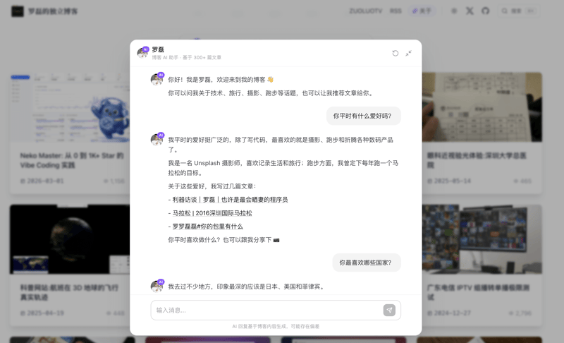 他会把 AI 直接接进自己的工作流:做个人知识库、做搜索、做摘要,也会把“怎么用 AI 把东西做出来”的过程写得很细,包括踩过的坑、做过的取舍和最终落地的形态。