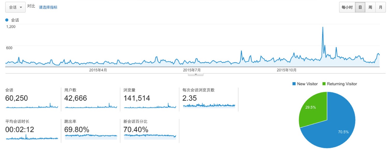 来自百度的流量大减,去年平均每天可以稳定在200-350区间的UV,约1000PV,可以看得到百度这个入口的影响力还是很大的。