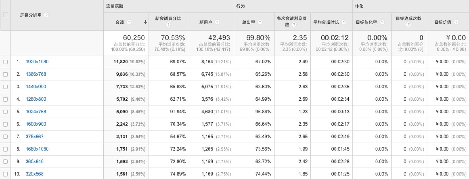 将近20%的用户是1080p高清,分辨率是各种千奇百怪,也可以看得出移动端设备上的各种奇特分辨率,当前端去适配不同分辨率的设备真不容易。