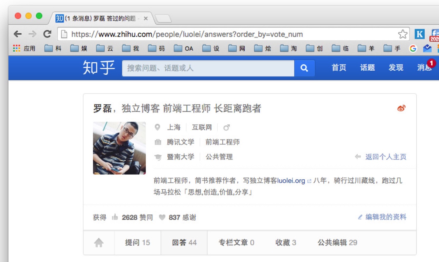 知乎上目前有1544个粉丝,收获了2628个赞同,837个感谢。