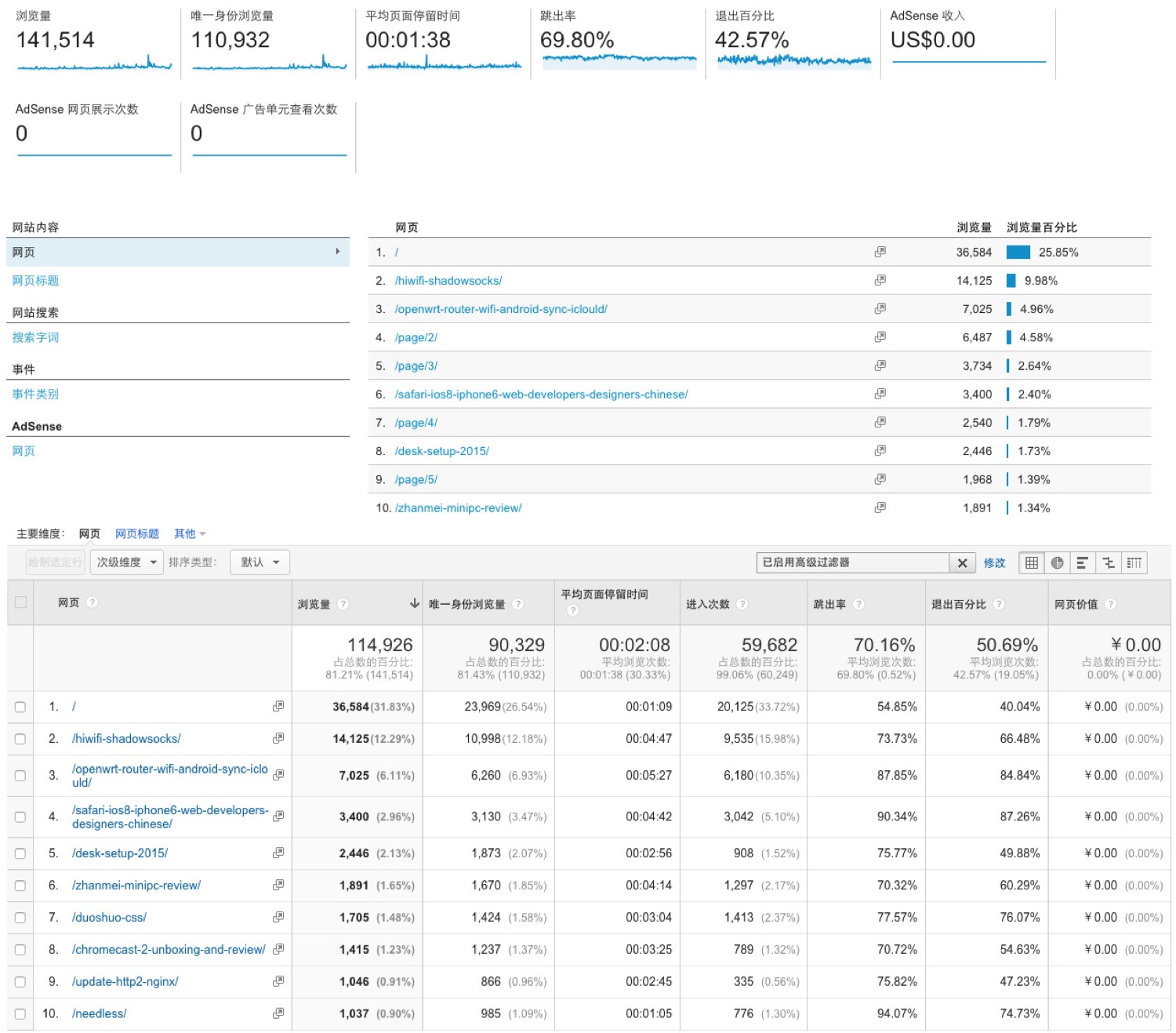 33.95%的流量是来自其他网站的外链,直接访问的占32.13%,来自搜索引擎的占31%,差不多33分,谷歌的SEO效果尚好,几个小尾关键字(尤其是技术相关关键字),我的博客都是排名第一或者在第一页。