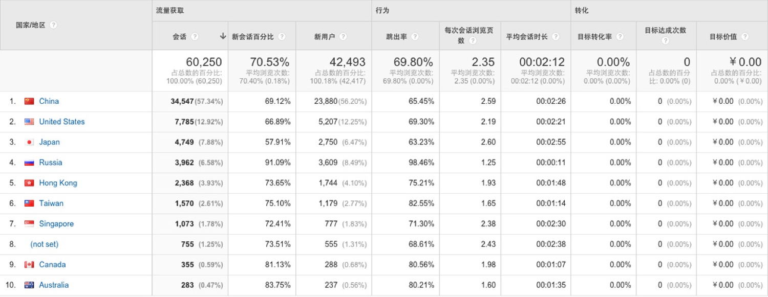 作为一个中文博客,约57%的流量来自中国大陆,12.92%的流量来自美国,排名第三的是日本,香港和台湾地区的用户排名第五和六,挺好奇地是居然还有6.58%的用户来自俄罗斯。