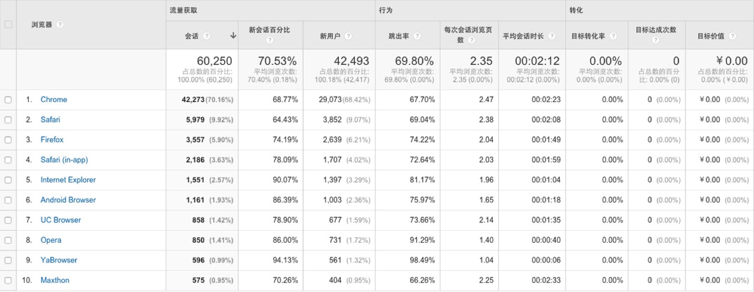 喜闻乐见,超过70%的用户都是Chrome用户,加上Firefox、Safari,可以确定90%以上的用户使用的是高级浏览器,也正是依照这个数据,我的博客很早就放弃了对IE8以下的支持。