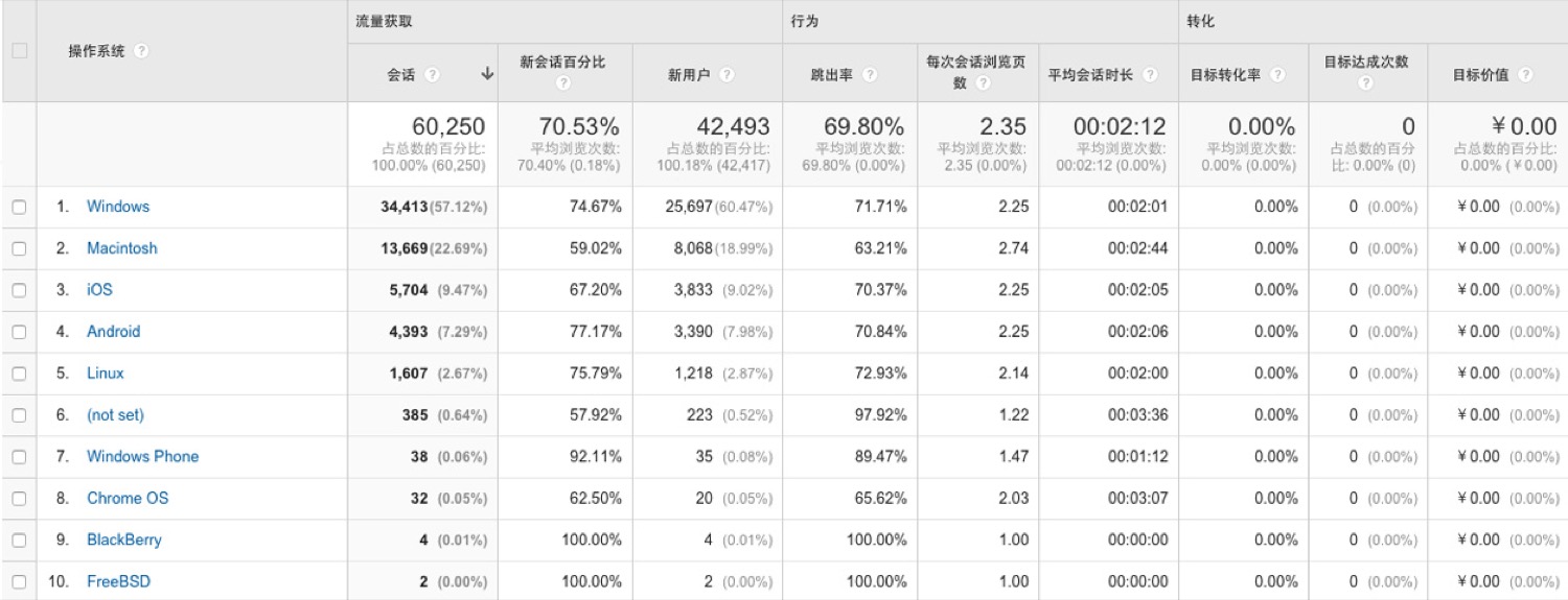 57%的用户是Window,22.69%的用户是Mac,iOS和Android持平。Mac用户加上上面几个数据的匹配特征,基本可以确定不少访客应该是IT业界的同行。