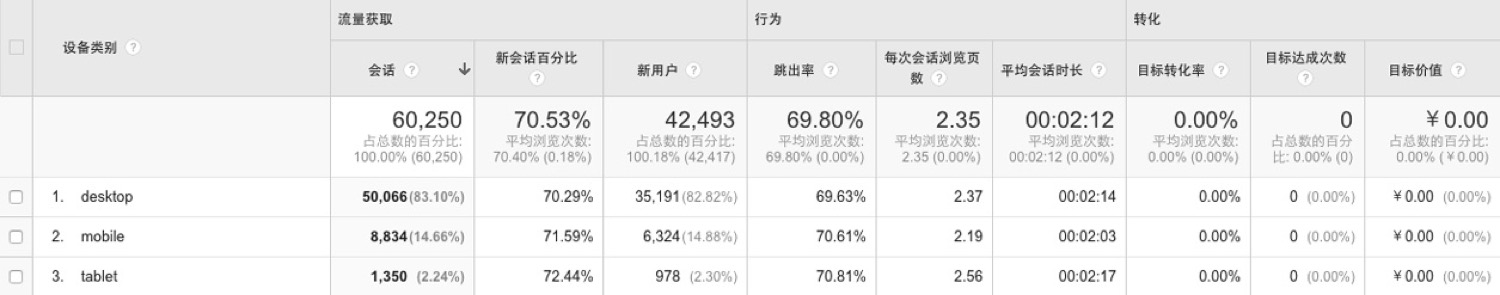 83.10%的用户是桌面浏览器,14.66%的用户是移动端,2.24%的用户是平板,来自电脑上的用户还是大头,应该不少都是外链和搜索引擎过来的。
