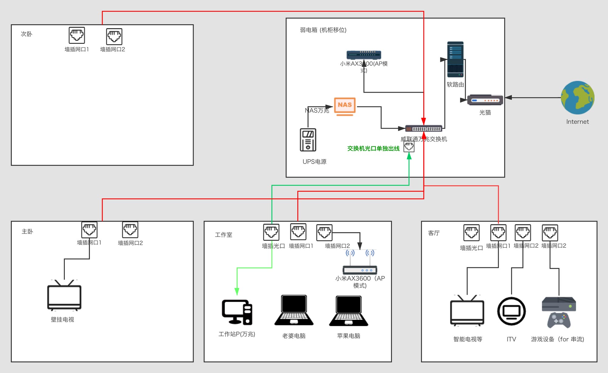 方案 B 是,基本弃用原来的弱电箱,直接把原来的弱电箱功能,完全转移到工作室的机柜。这样有一个好处就是,就是所有的设备,都能放到一个工作室的机柜中,方便维护,工作 PC 与 NAS 之间,就不用走墙里的光纤了,万兆直连即可。