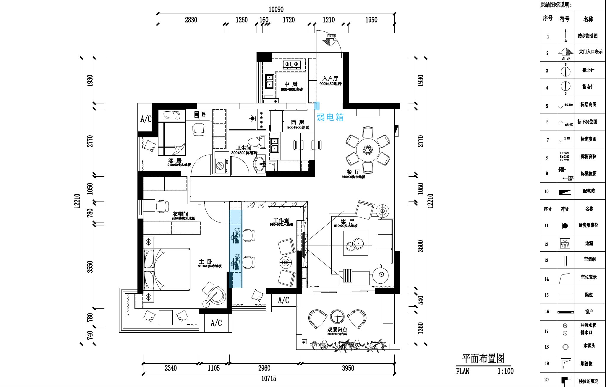 这是当前的房间布局图,原来是三房两厅两卫,原弱电箱在客餐厅入口。厨房墙打通,做成开放式吧台,一间卧室的墙打掉,用玻璃隔断,做成半开放工作间。