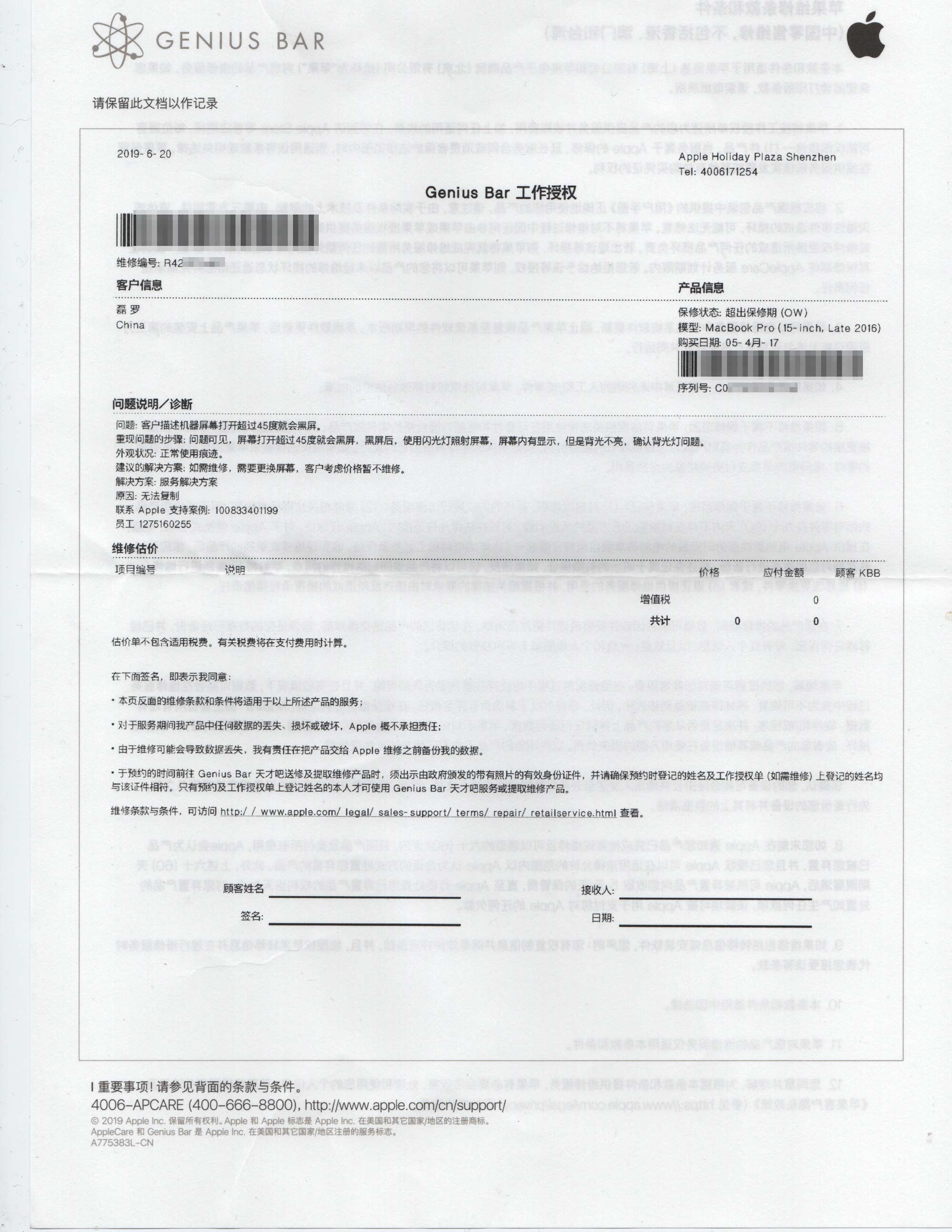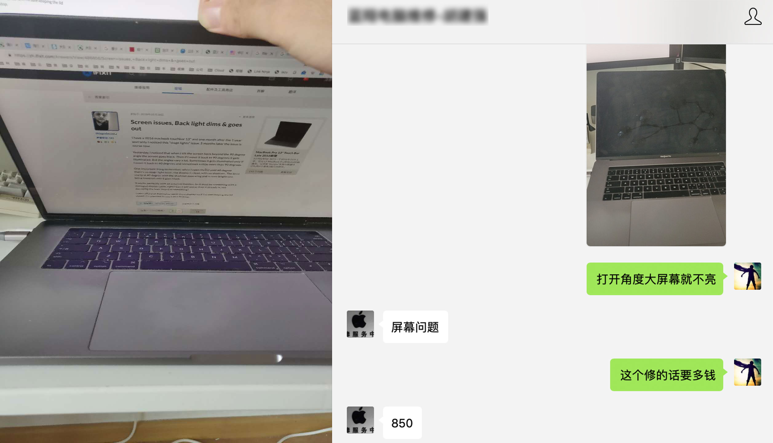 无奈自己要使用MacBook,自费去华强北维修。维修难度比想象中高,需要拆开屏幕,压屏,价格850人民币,花费3-5小时。就此与Apple的维权,可以说是以失败告终。