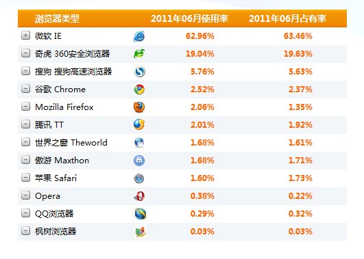 厄,没错,在我们带三个表,代表先进生产力的中国,Chrome娘只有可怜的2.52%市场份额,前三牢牢地被几个IE内核的浏览器给霸占了。