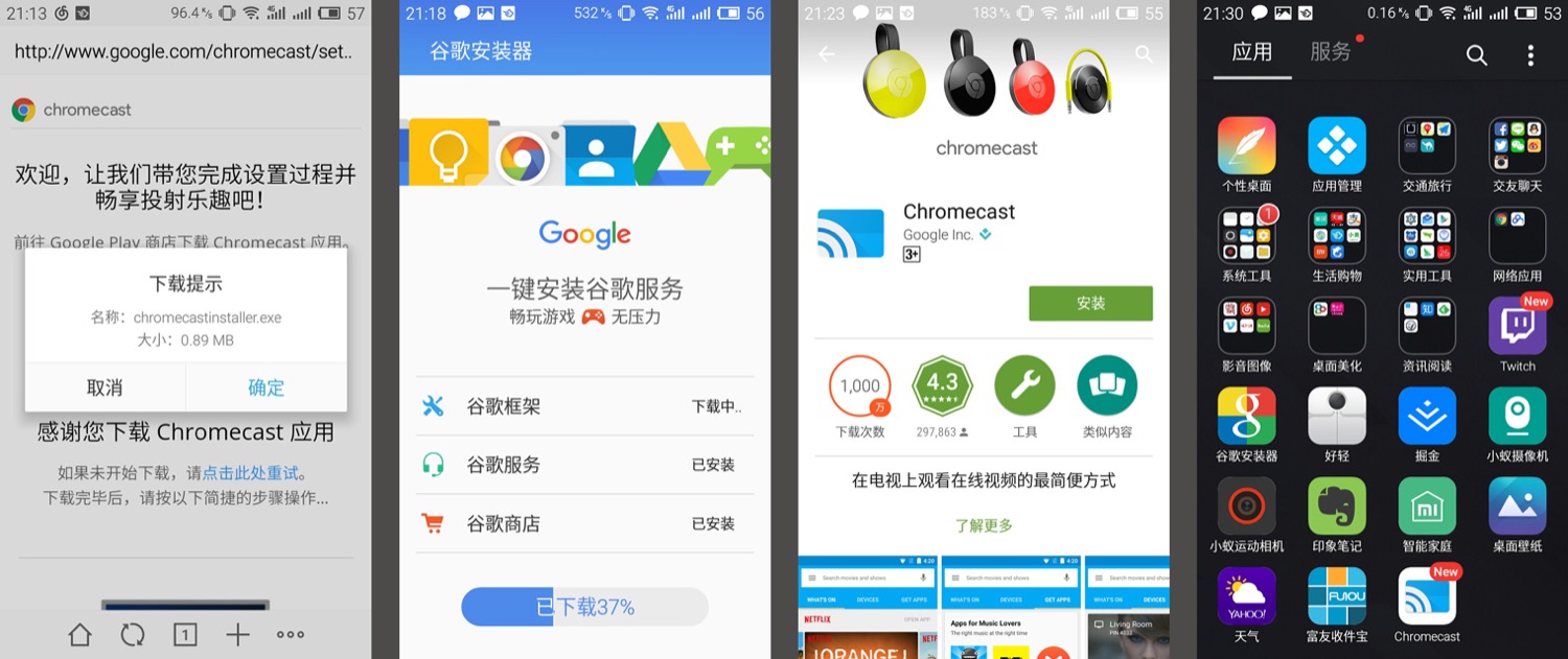 由于Apple Appstore中国区并没有上线Chromecast应用,无奈只能选择用Android机进行激活,注意,安装Chromecast需要你的Android手机能正常使用谷歌服务,我的Android机是魅蓝2,安装完谷歌服务框架后,直接从Google Appstore下载Chromecast应用。