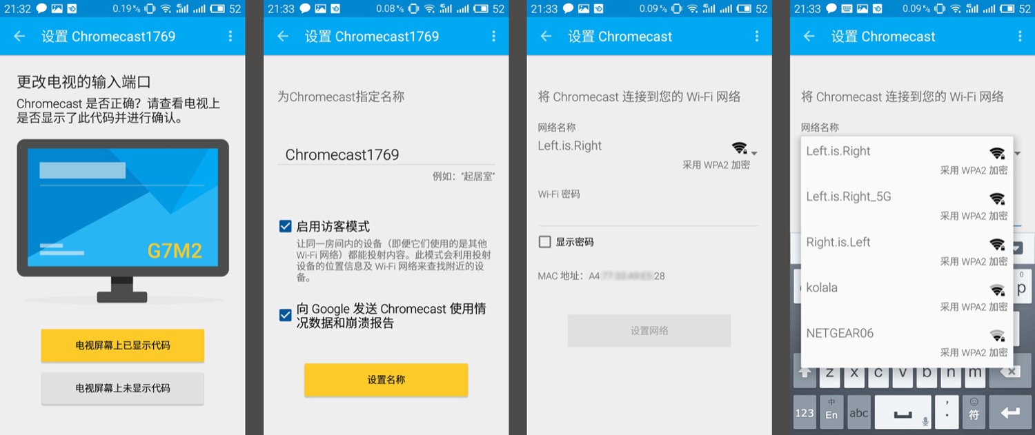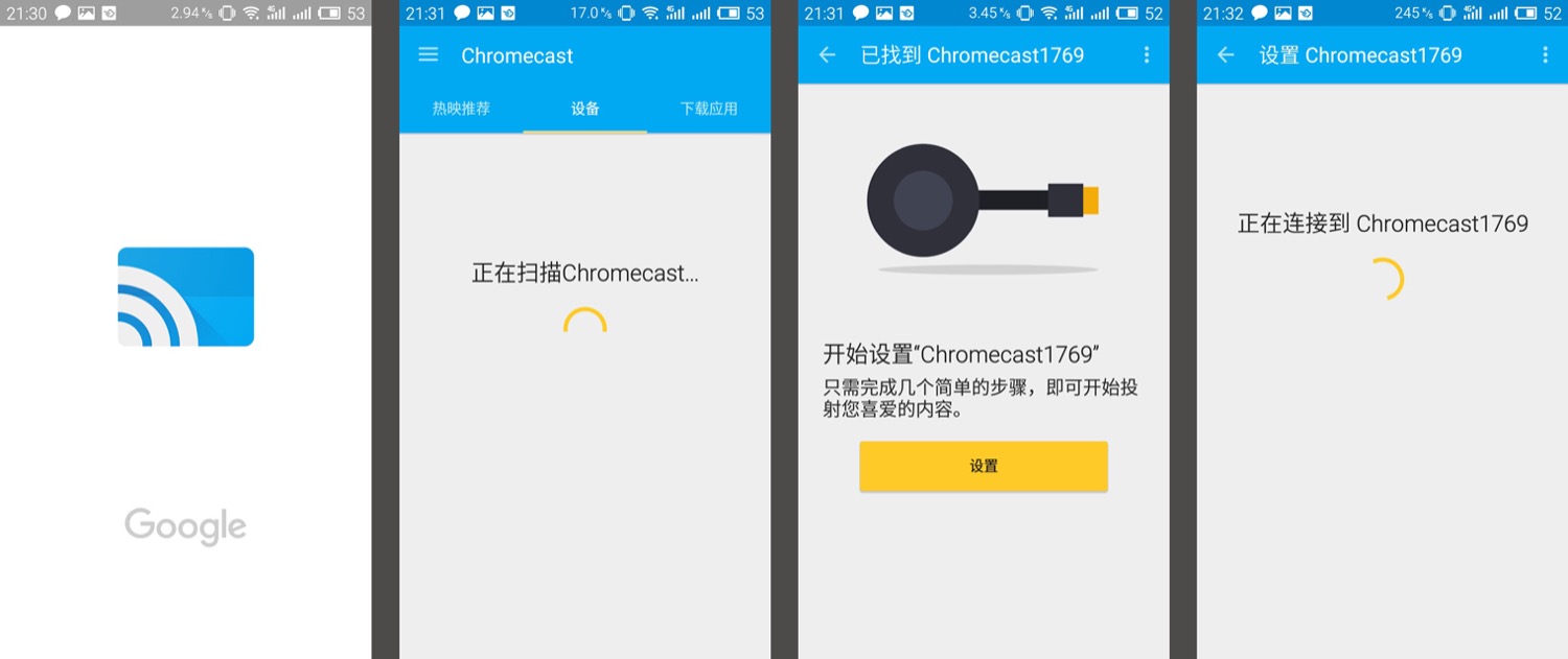 接着,就打开Chromecast,按照App的提示,一步一步进行适配。Chromecast硬件会智能扫描环境中的WIFI,与你手机设备连接,具体的原理普通用户不需要了解(话说刚好前公司做的智能硬件WIFI连接也用了这种解决方案)。