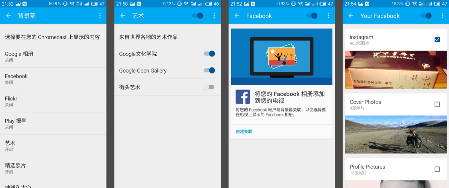 首先看一下Chromecast App,扁平化的设计,符合谷歌的Material Design规范,在「背景幕」设置里面,可以设置Chromecast的显示背景的图片来源,有Google相册、Flickr,NASA的航天图片、本地天气等等,当然也能直接绑定你的Facebook帐号,绑定好之后,会可以让你在选择不同的相册,待机的时候,会轮播你相册里的照片,很适合放在公司、聚会的时候做照片墙。