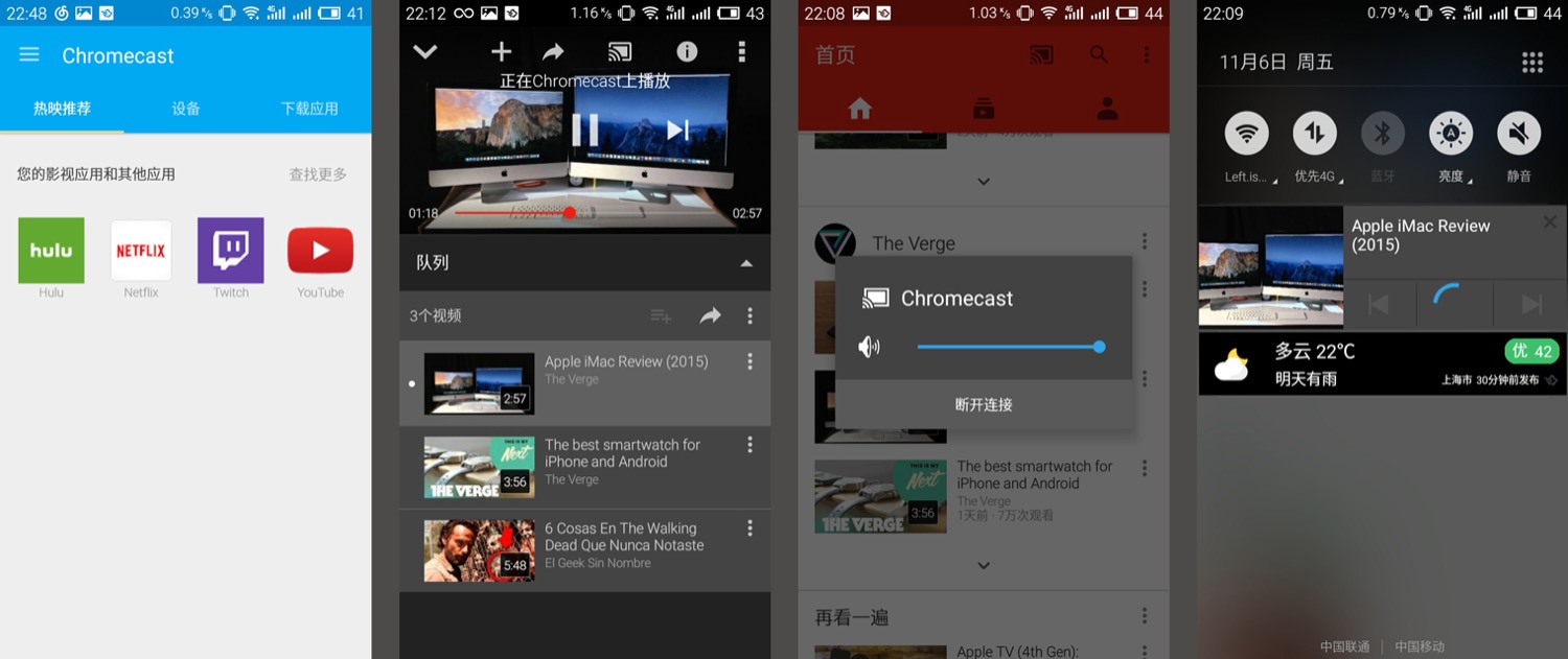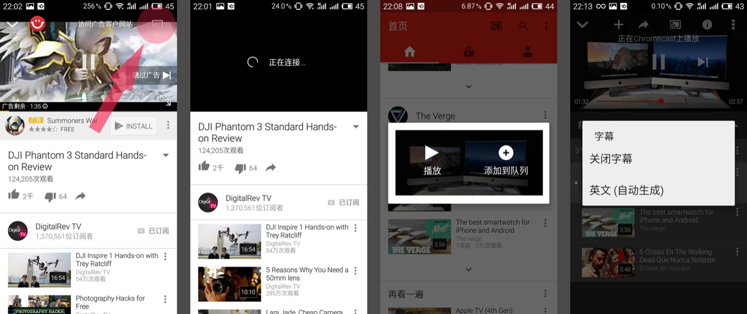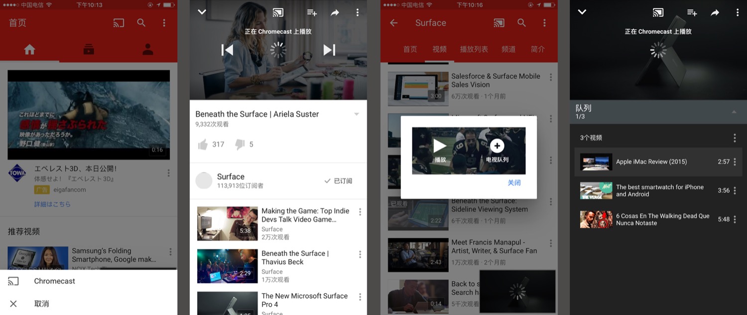 除此之外,Youtube中还能通过添加到队列进行播放列表的功能,可以把你随后想播放的视频都加到playlist中,chromecast会自动按照序列播放。