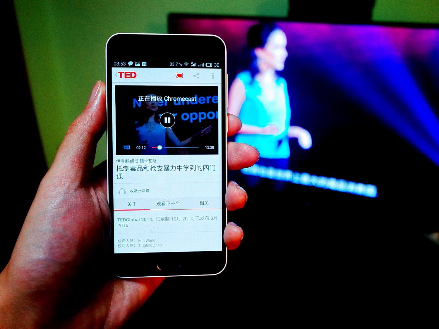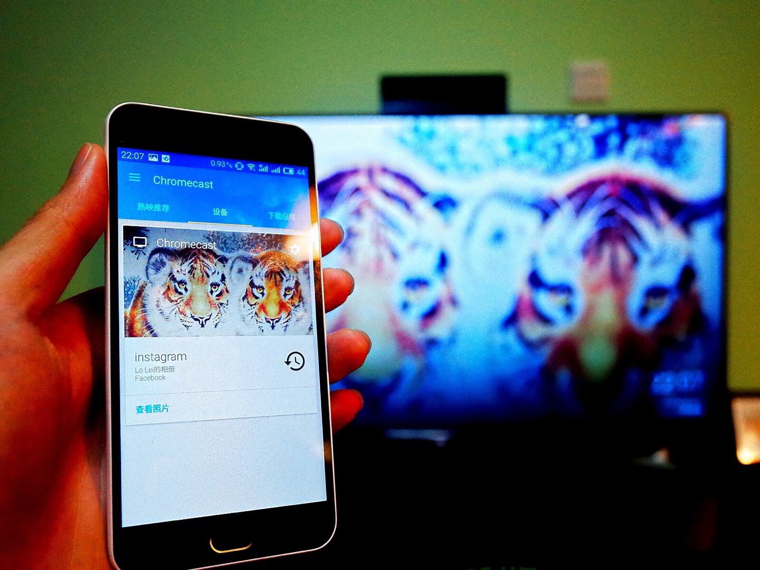 由于魅蓝2是720P的屏幕,所以在电视(1080P)显示并不完整,开启旋转后,电视上的桌面也会随着手机的旋转而旋转。电视上显示的内容跟手机上显示的完全一样,同时音频也同步了,这意味着你在手机上播放音乐、视频等,均会Cast到Chromecast上。