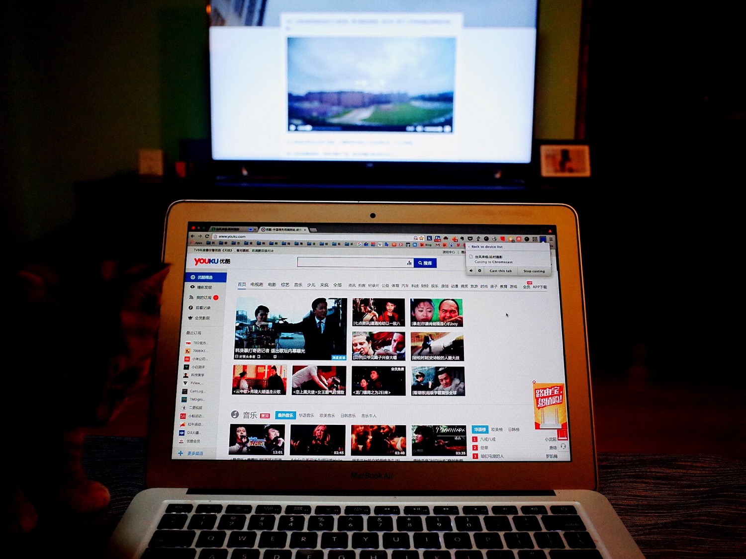 打开优酷,细心的你可能发现电视并没有播放页面的页面,这是因为Chrome里的Chromecast推送是基于网页标签,你新开或者切换Tab标签,并不会切换到这个Tab下的网页内容,如果你需要切换,你需要重新选择Chromecast推送。