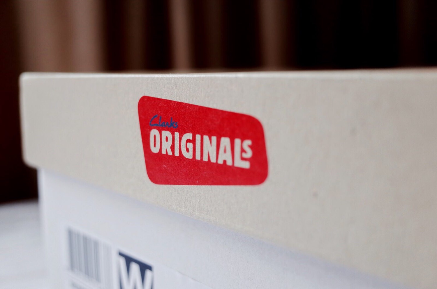 箱子上下、两侧都有Clarks红底白字的Logo。