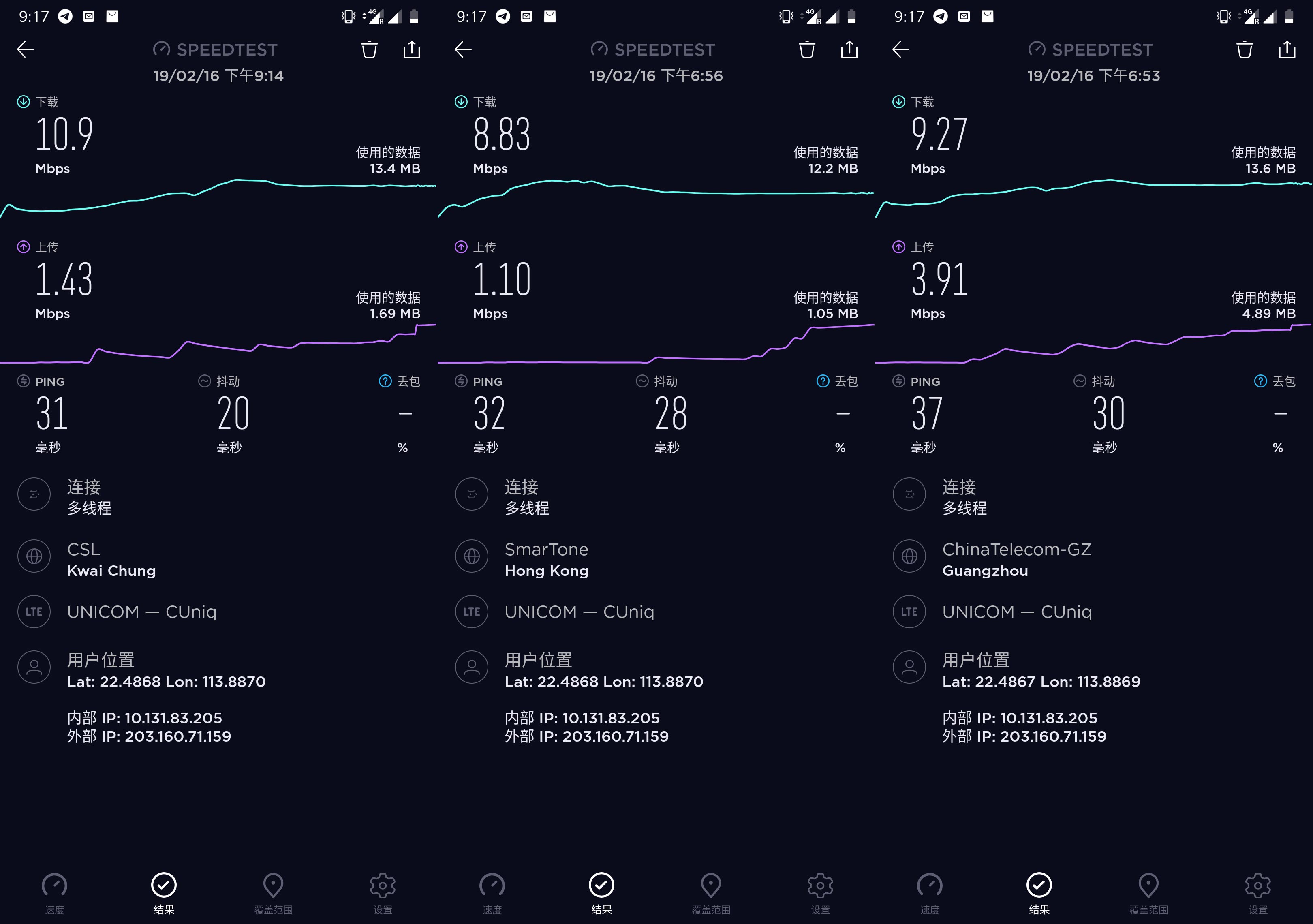 使用SpeedTest测速,外部IP是203.160.71.159,香港IP。