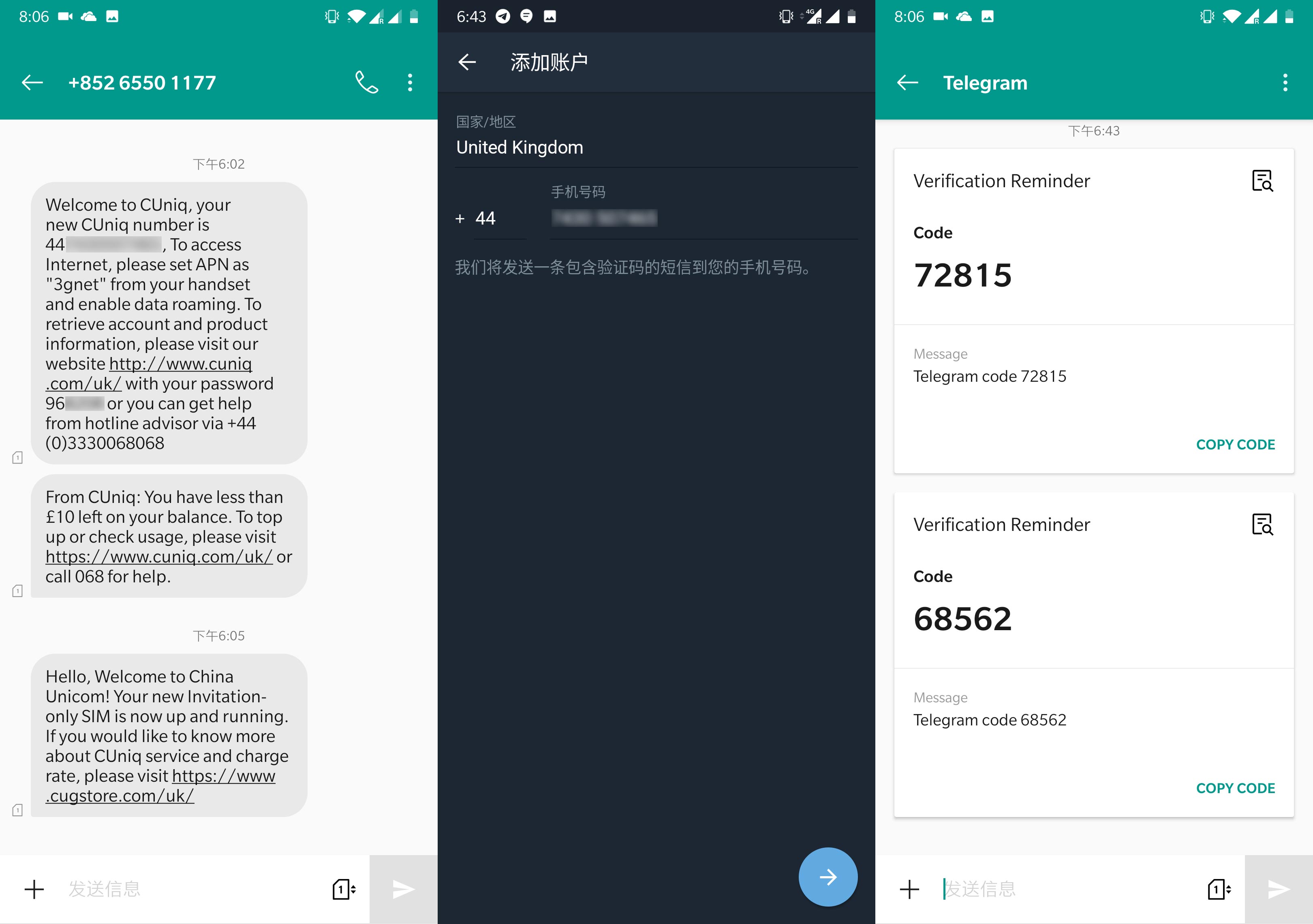 等一会收到了激活确认短信,会告知你一个6位数的密码,登录官网CUniq UK使用手机号 + 这个6位密码就可以激活。我用这个号码注册个新的TG号码,也正常收到了短信验证码。