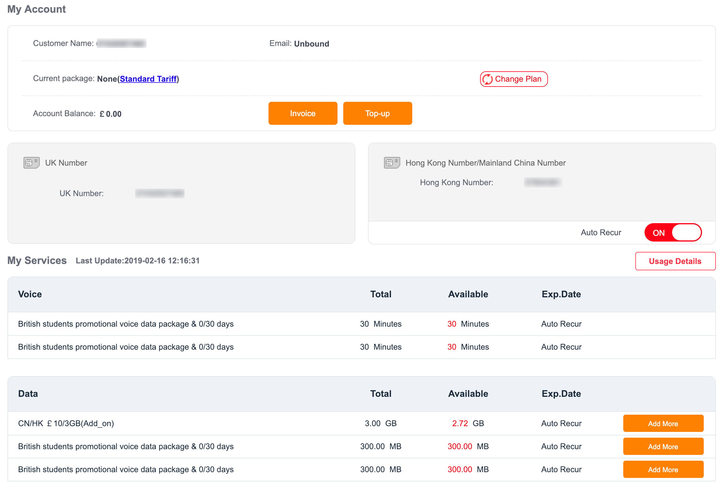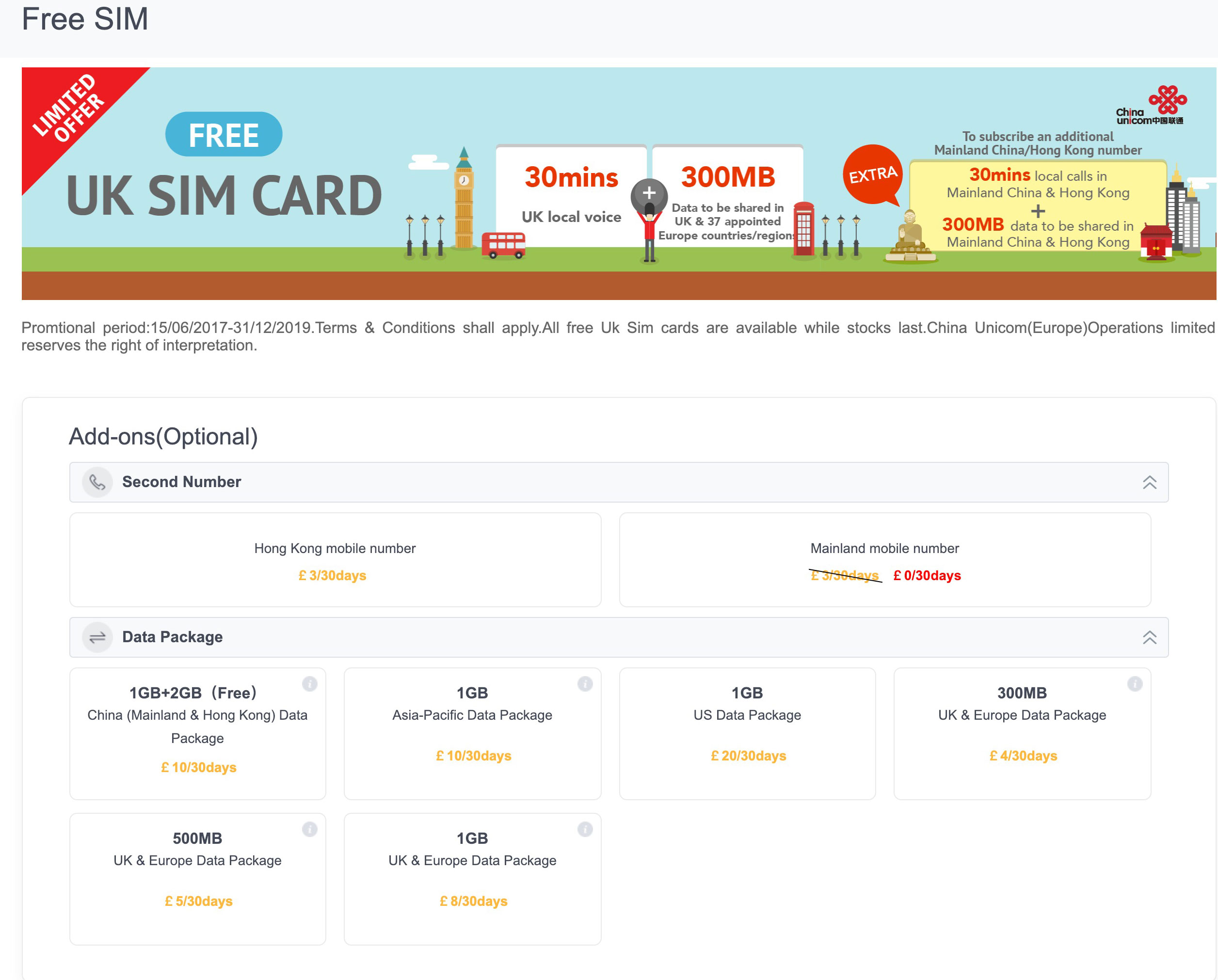 - 数据套餐1+2(free)共3G目前是10英镑/月,优惠有效期是到30/06/2019,客服说到时候优惠套餐可能有变动,到期后是否还有这个优惠价格,以官网为准,我看了下中国联通香港官网,最近出的几个大中华套餐,到时候,保持这个价格和流量的可能性还是挺大的。