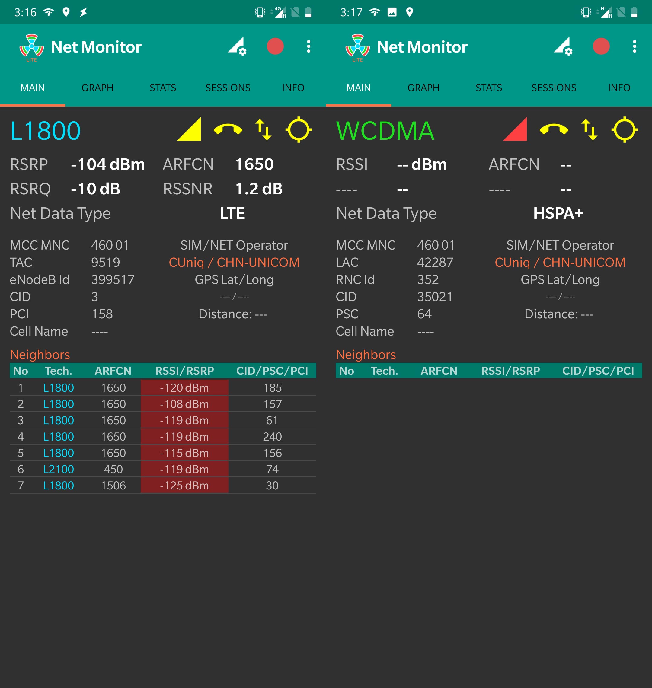 激活也比较简单,直接插卡到手机里,过一会就能搜到信号了,使用Net Monitor查看蜂窝网络数据,MCC/MNC显示是 460 01,对应中国联通的LTE 4G网络。可以直接打电话出去给中国的手机号,来电显示是英国44开头的号码。