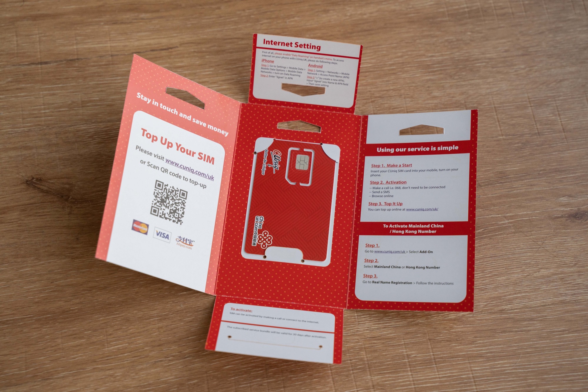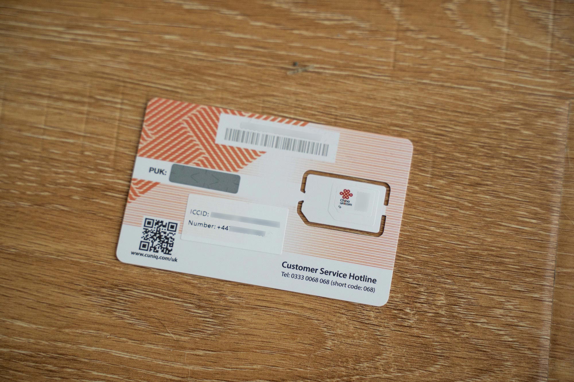 收到的就是这个卡。卡上面有简单的激活说明、客服电话等等,也直接印上了英国的号码。