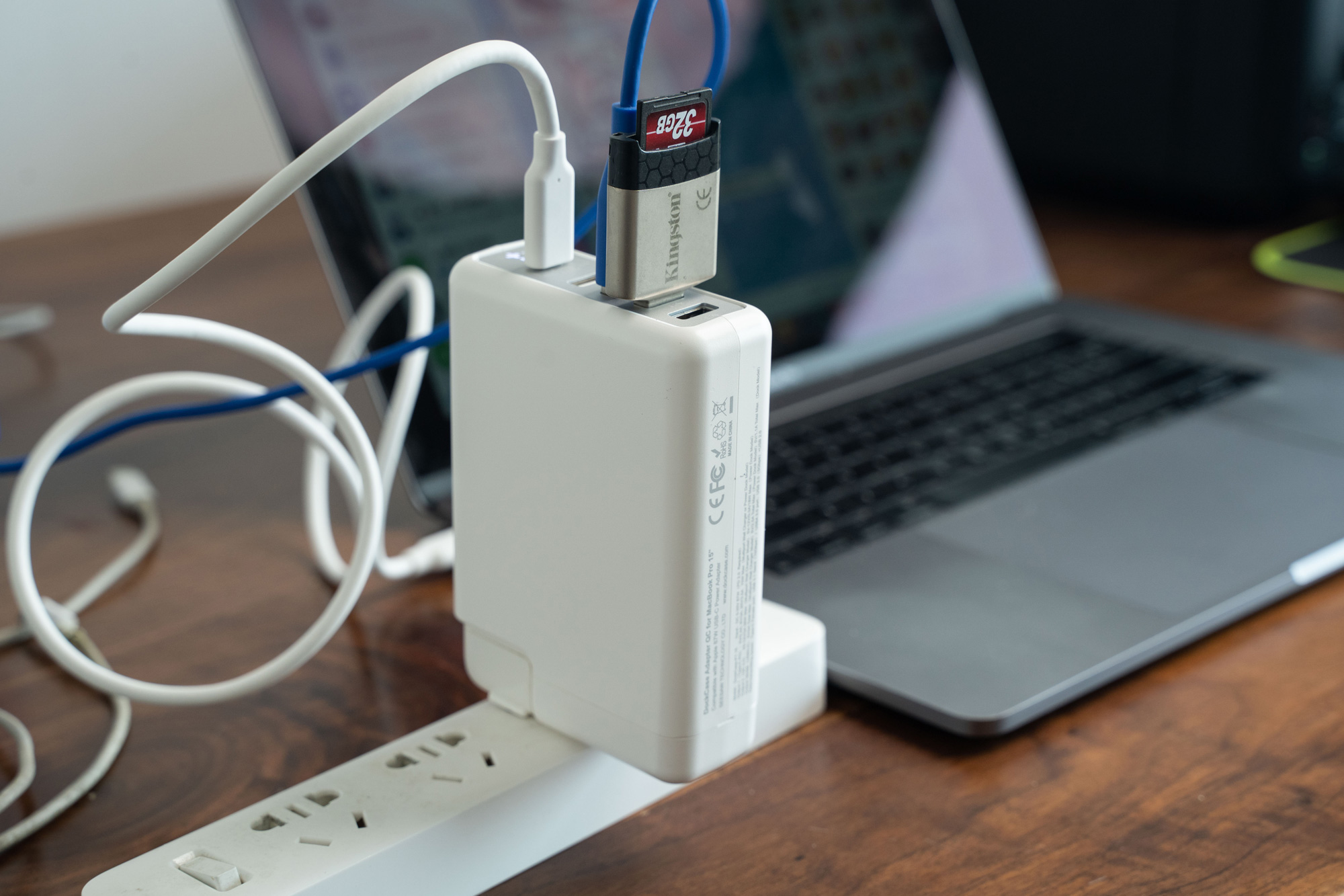 但是MBP这个充电头却有一个问题就是「大和重」。这么大的体积,只有一个TypeC接口,对于差旅党来说,出门在外,带这么一个头,仅仅只为了充电,实在是有点「大材小用」。