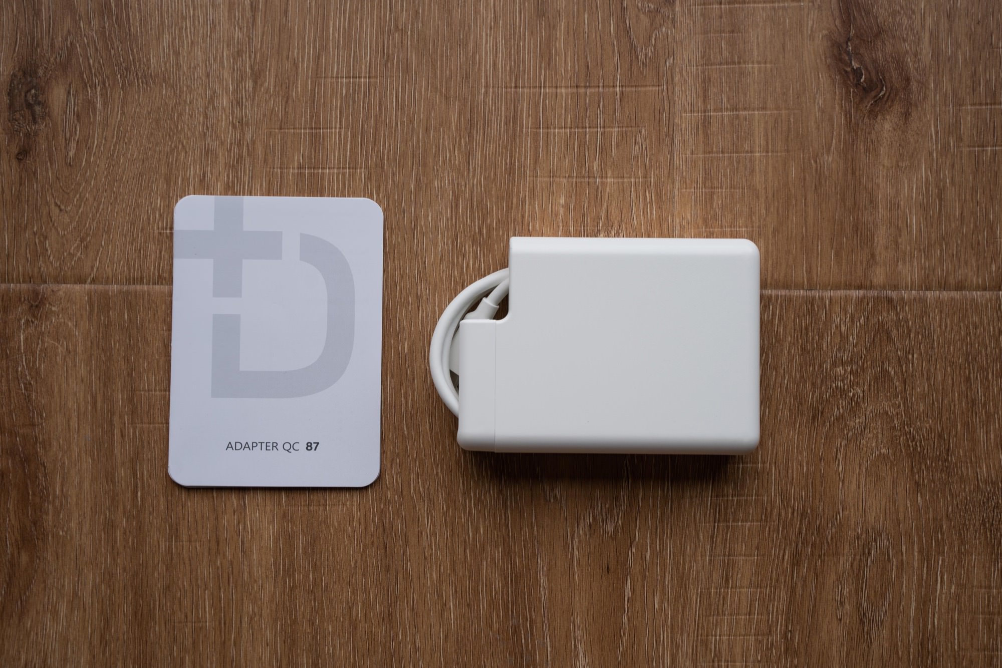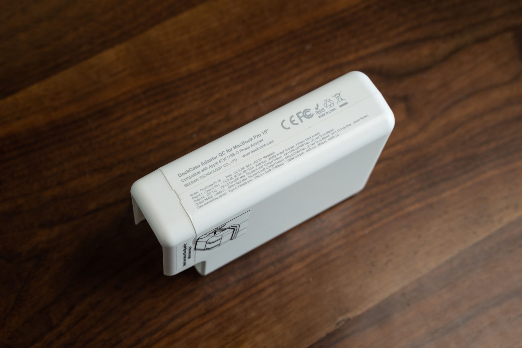 DockCase 真身,底部印有产品信息,全名叫"DockCase Adapter QC for MacBook Pro 15",适用于15寸MBP的87W电源适配器,下面的小字密密麻麻印着电压、接口信息相关的参数。