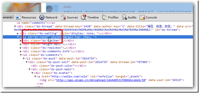 这时,别忘了再看看这个id包含在什么DIV结构内,往上看,发现了文章页面的多说评论栏总结构被div定义为