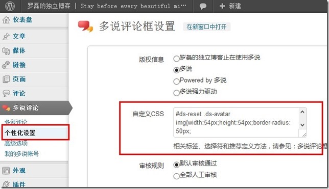 登陆你的wordpress管理后台>多说评论>个性化设置>自定义CSS