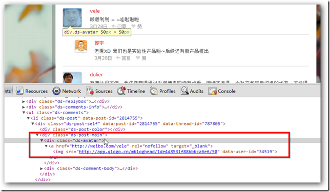 此时,就找到了评论栏中头像的对应类选择符(为等会自定义css准备)。