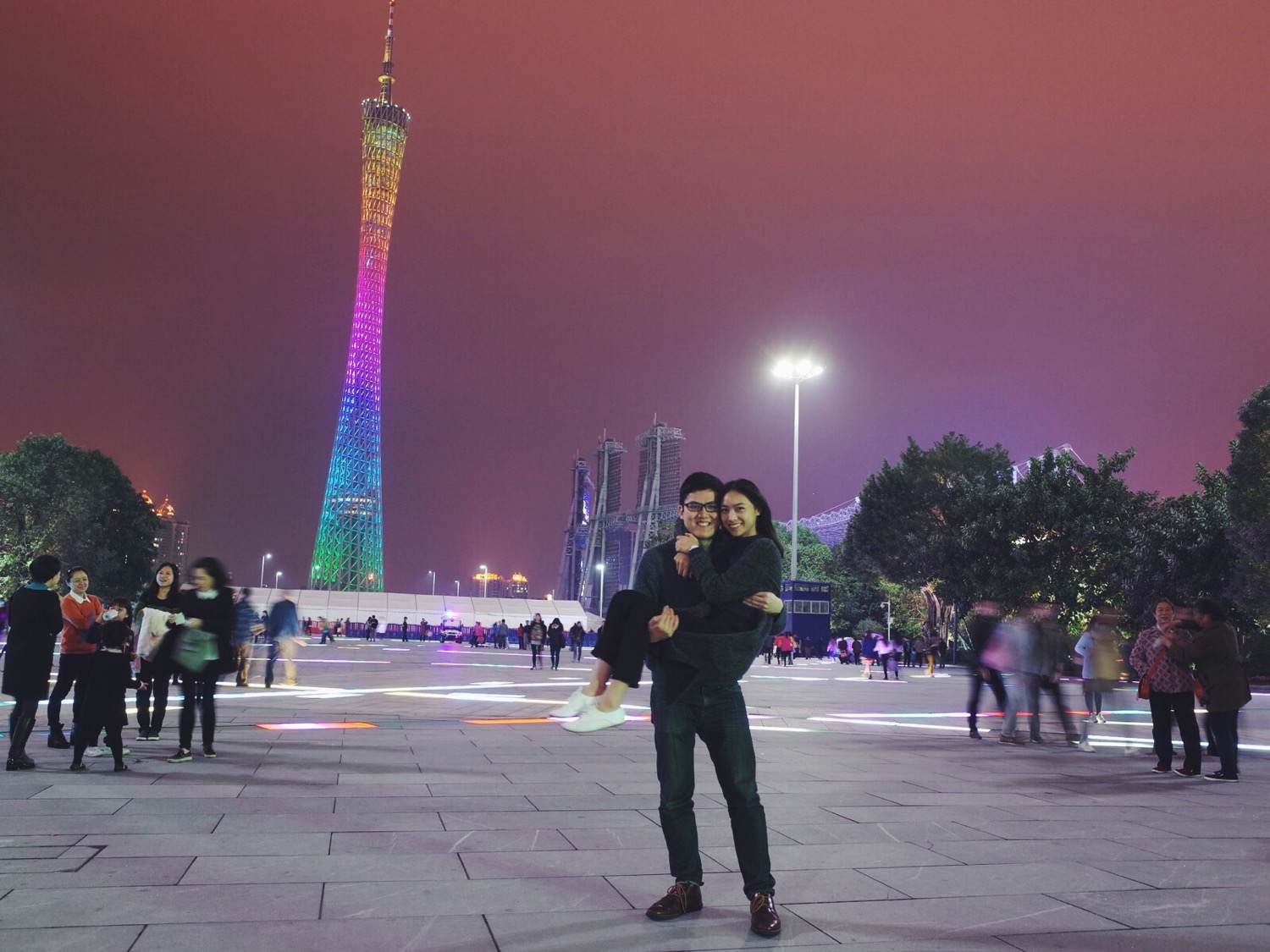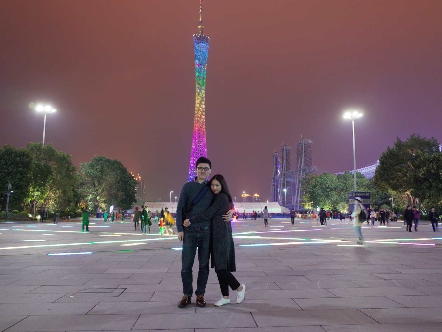 广州塔又叫小蛮腰,广州的地标建筑,覆盖着彩色的LED灯,会动态变化,十分漂亮,趁着彩虹色,赶紧抱起妹纸来了几张合照。