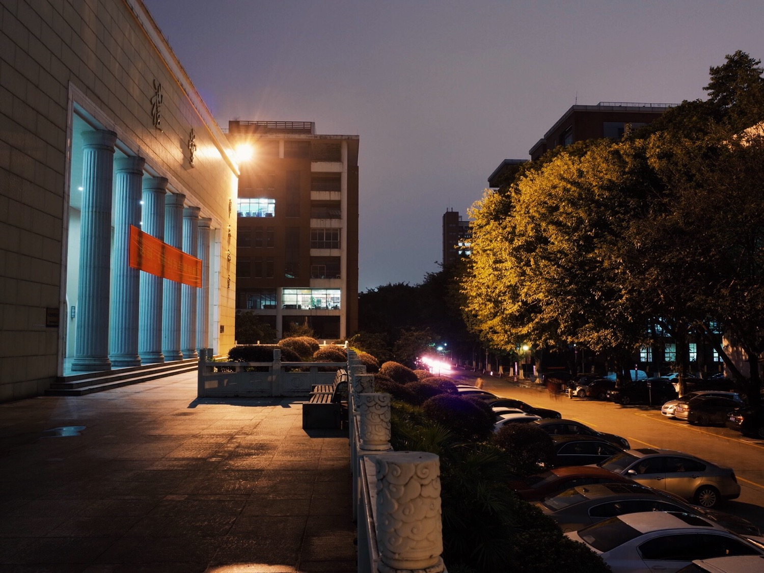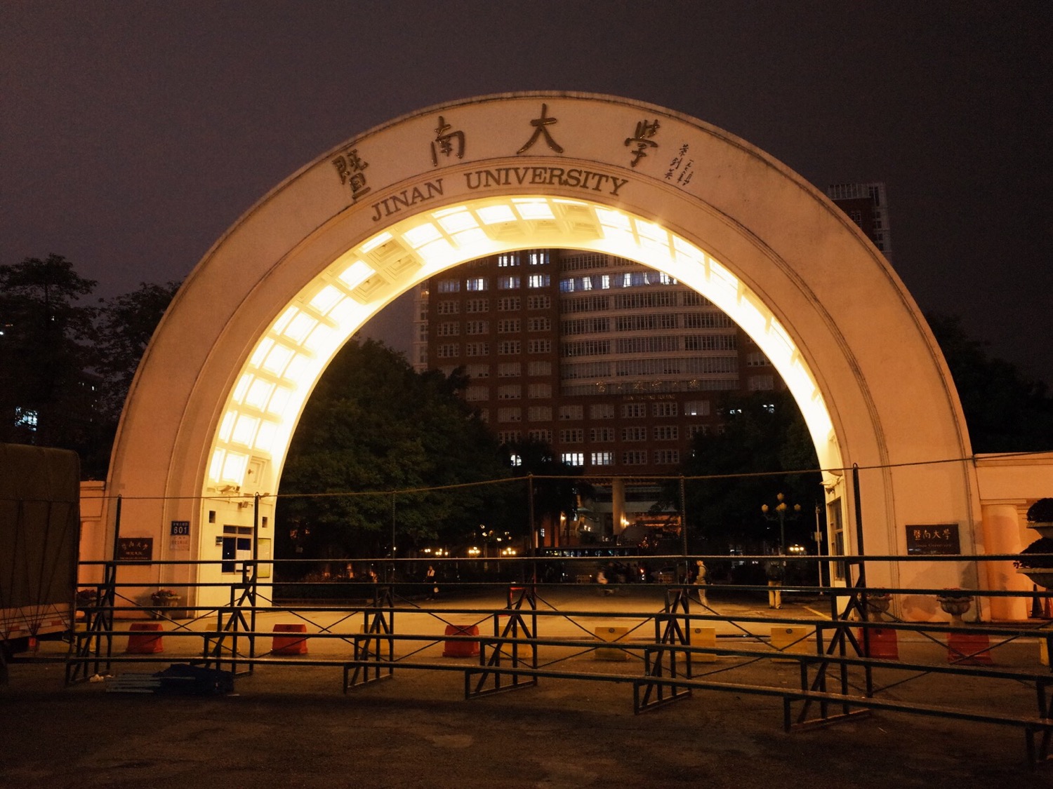 从校区北边的宿舍走到了最南边,黄埔大道边的这个拱门,也算是暨大的一个地标,每年的毕业照都是在这里拍摄,今天过来,这边还有白天拍毕业照架设的架子。