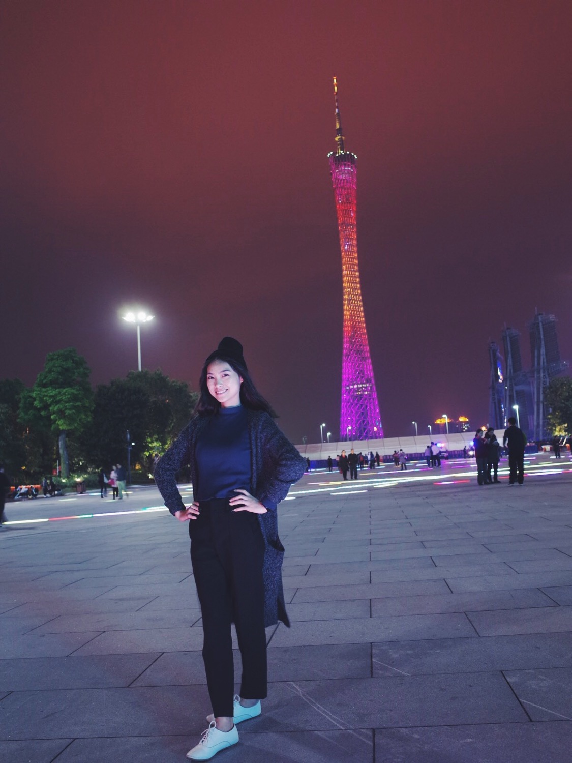 妹纸第一次来广州,今天人不多,在广州塔前留个影,背后就是广州塔和海心沙,2011年亚运会的时候,我就在右边的海心沙当志愿者,也是一段大学的回忆。
