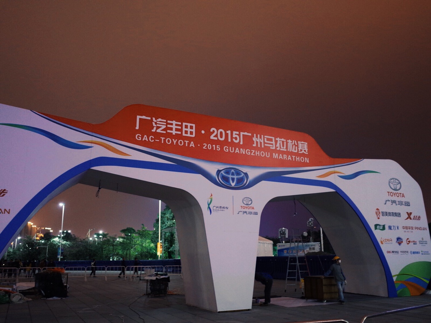 广州马拉松的起点也已经开始布置,星期天,大家就都要从这里起跑,这里也是全程马拉松的终点。