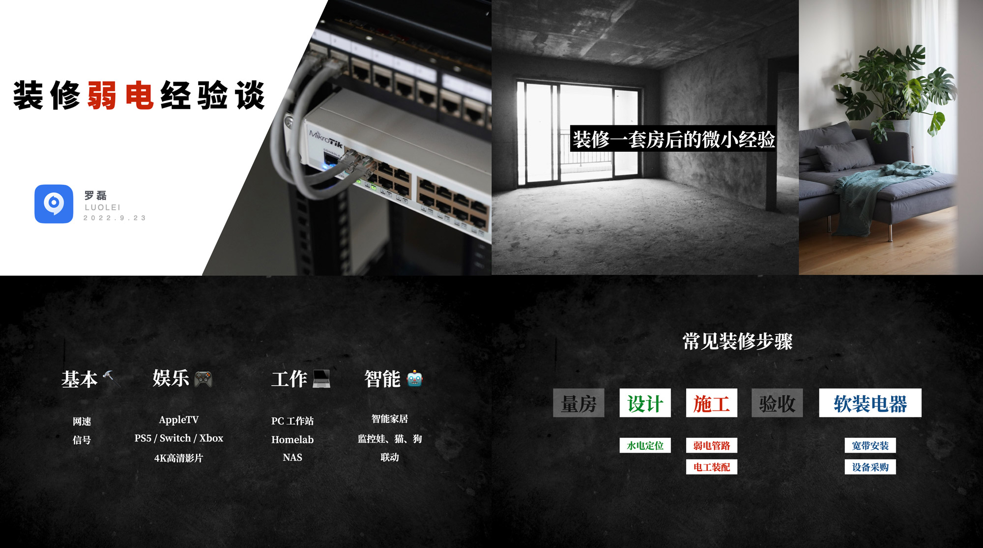第一篇分享,我打算从我的家庭弱电方案开始说起。上个月刚好在公司内部,做了一次「家庭装修弱电经验谈」的分享,这篇文章,也会基于那次分享的脉络架构,给大家以更详细的参考。