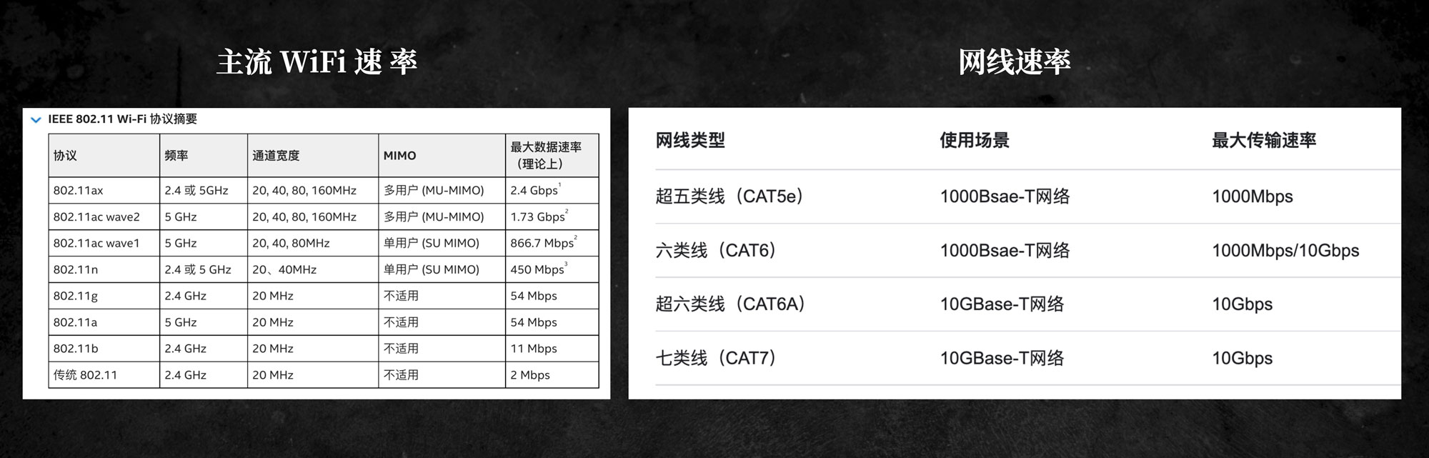 上图是目前主流WiFi速率和有线速率的对比,虽然可以通过路由器拓展和 AP 节点来保证网速和信号,但是网线的价格大大低于无线设备,稳定性也更高。尽量还是让自己家里的每个房间都拉上网线。