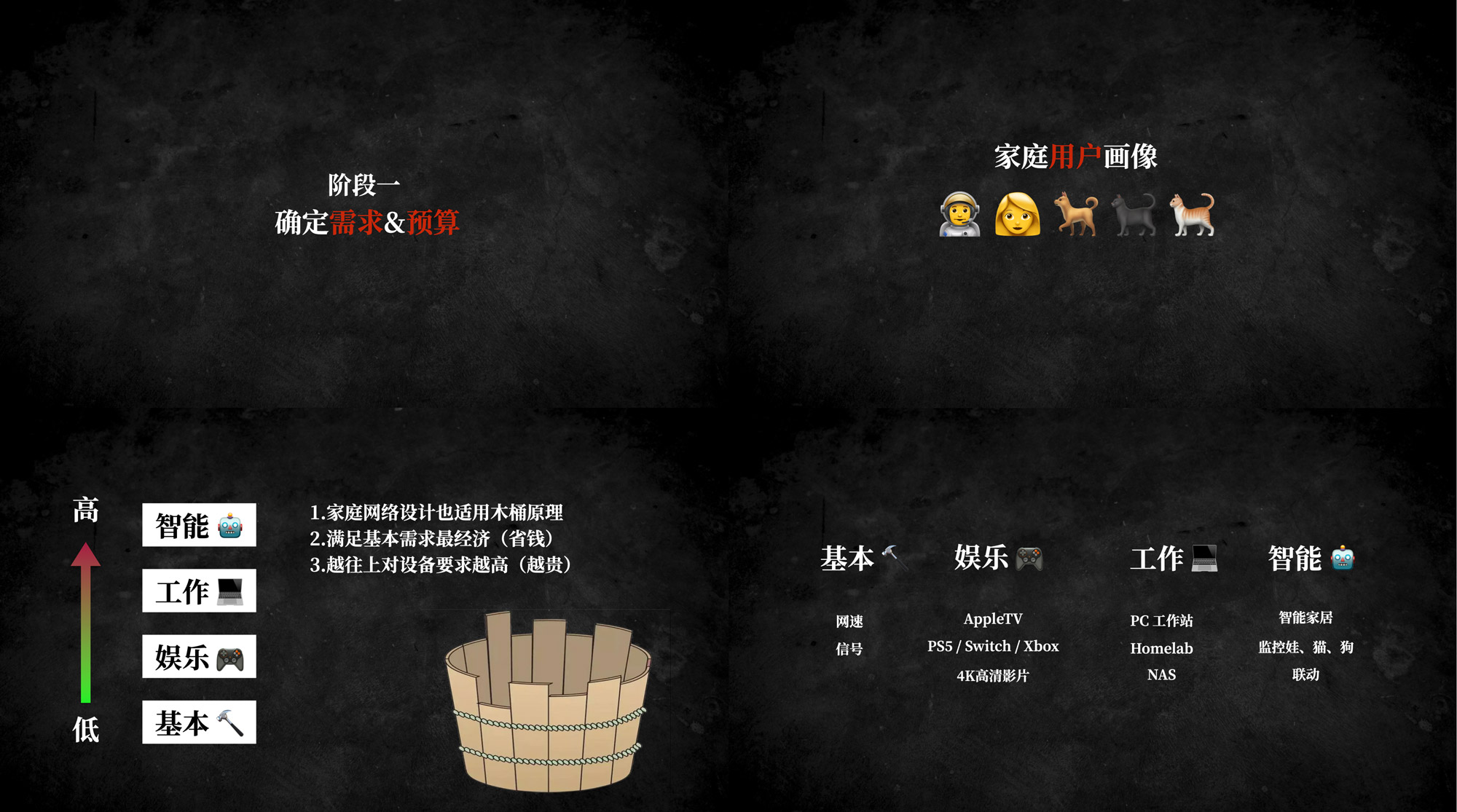需求我按照自己的理解,分为了基本、娱乐、工作、智能四个分类。家庭网络设计也适用木桶原理,满足基本需求最经济也最省钱,需求越复杂越高级,往往也意味着越贵。