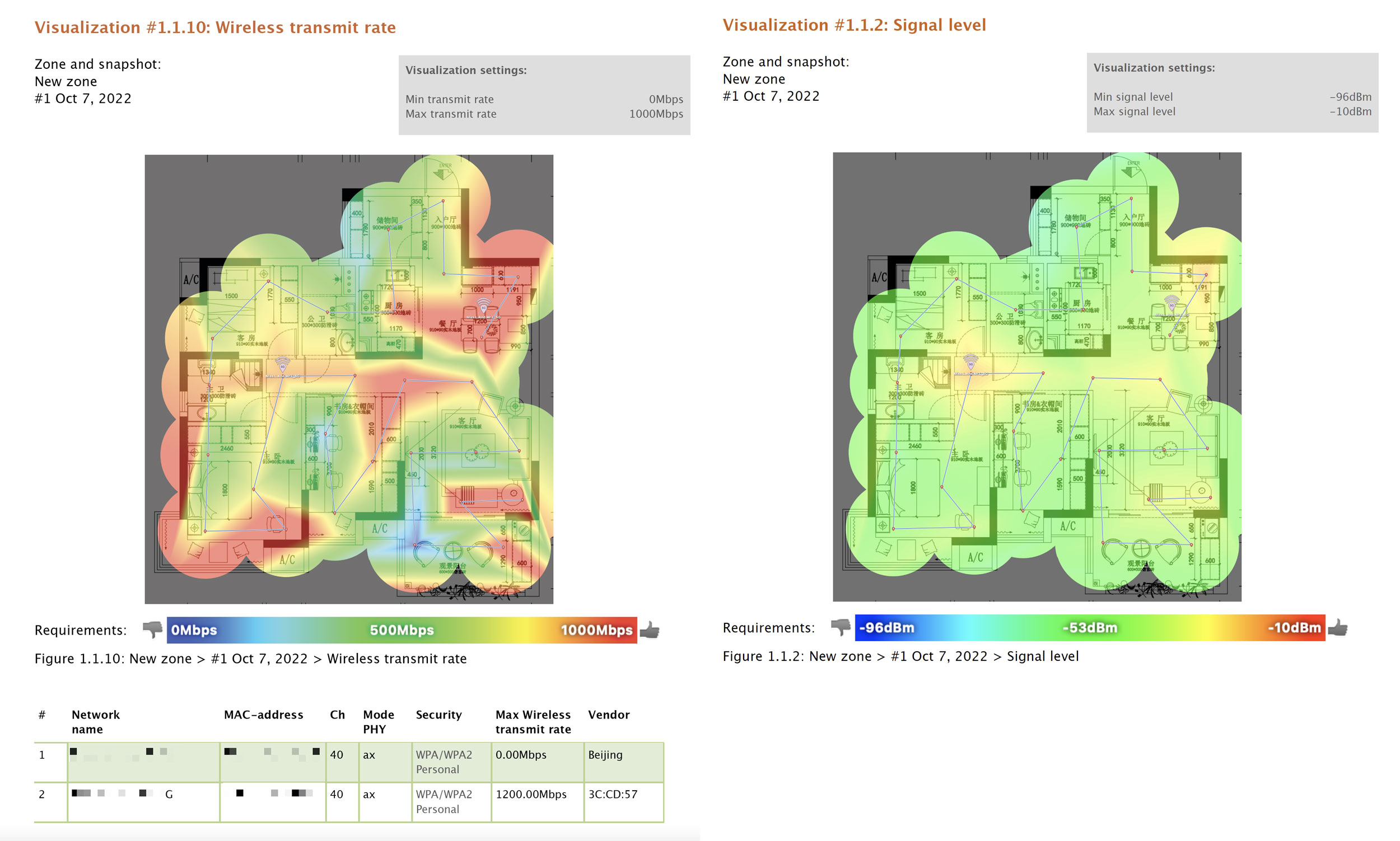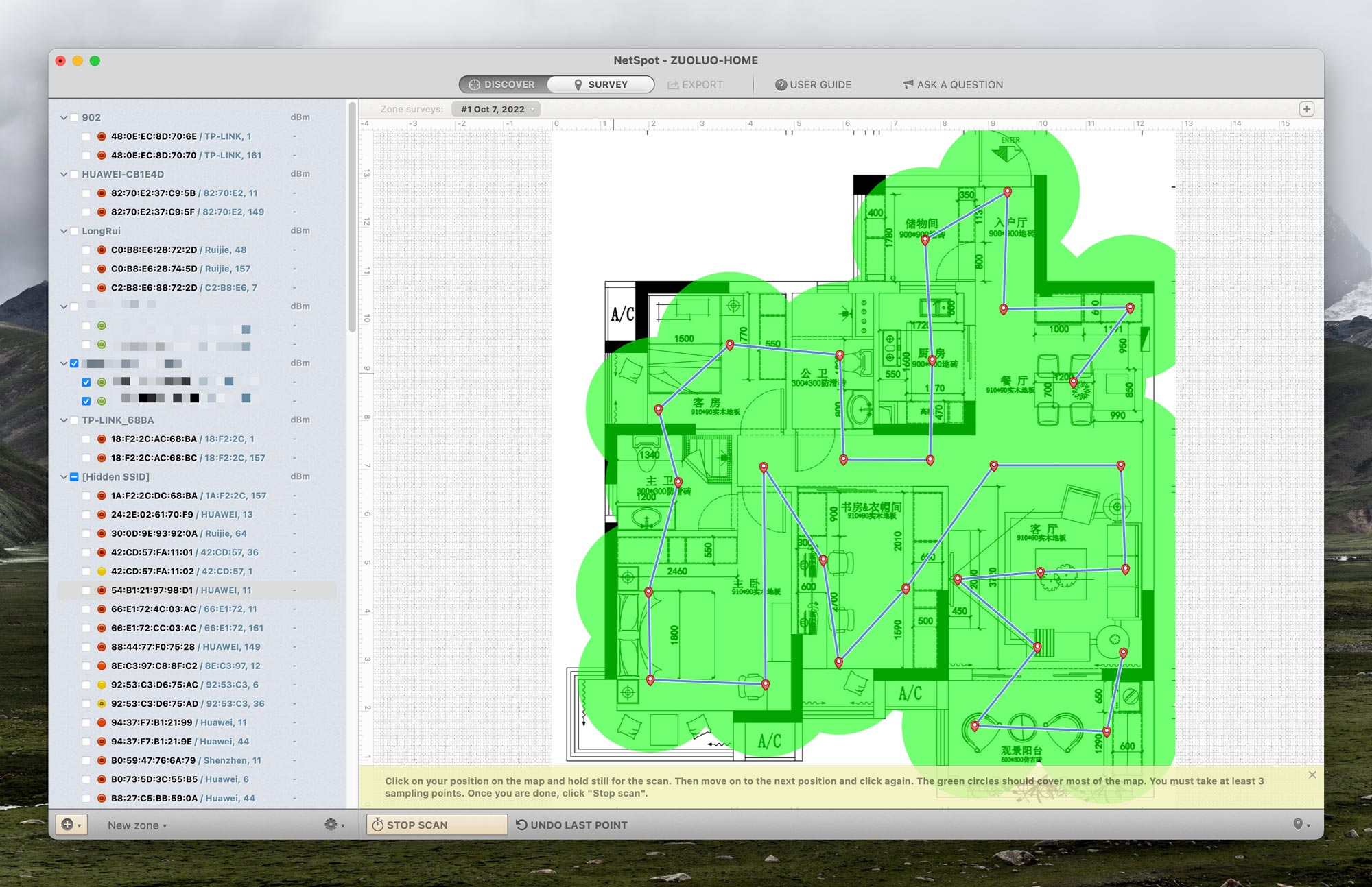 首先推荐的是 Mac 上的 Netspot , 这个APP支持导入你家的布局图,然后根据不同点位的测试,最后输出一份有关信号强度、速率等信息的综合热区图和PDF报告。