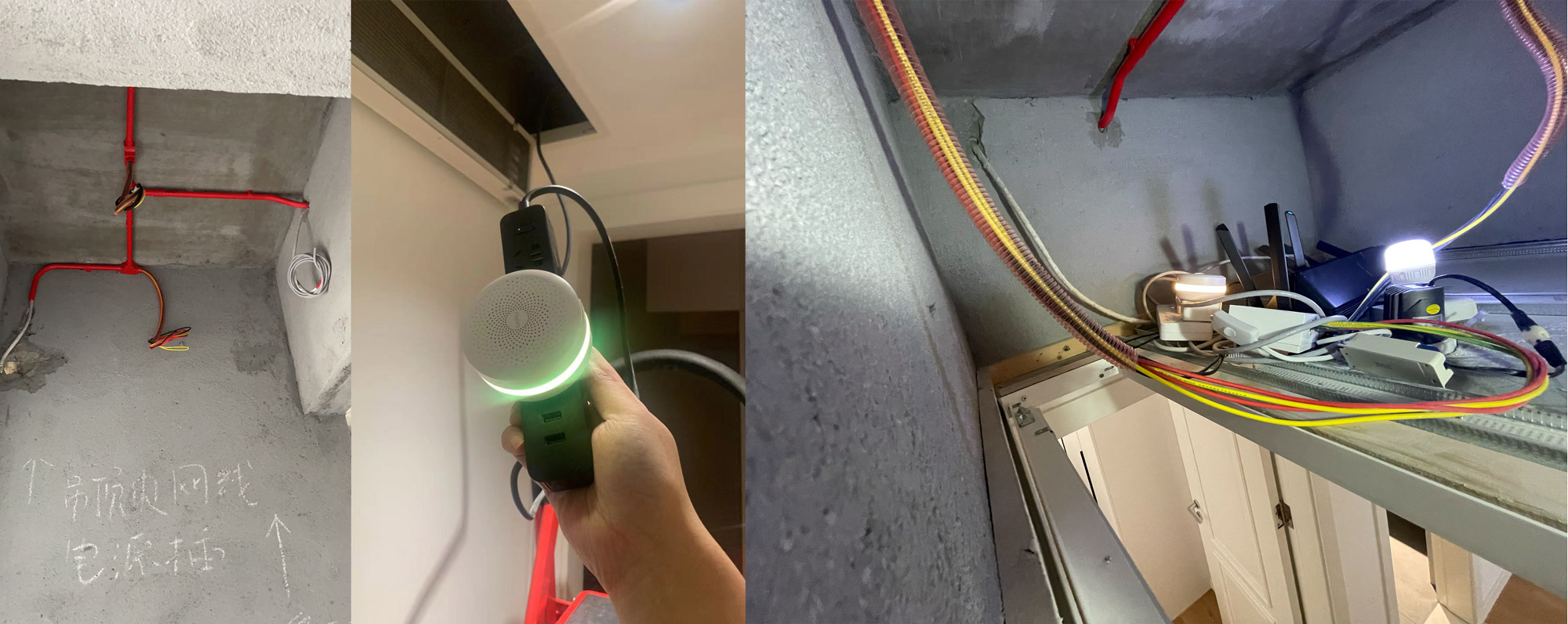 吊顶位置在水电定位的时候除了拉了网线,还额外拉了一根电线,由于走廊采用石膏吊顶,在上面放了智能开关、插座、路由器、绿米的智能网关。实现了WiFi和智能网关的覆盖。石膏吊顶不阻挡信号,对 WiFi 基本无影响。