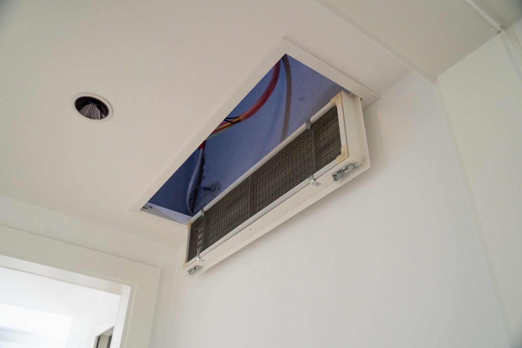 一开始我有考虑把机柜安排在书房,但是考虑到机柜的噪音问题,最终决定把机柜安排在餐厅餐边柜的角落位置,我家的走廊尽头刚好有一处吊顶有大量空间,又恰好处于全屋空间的中央,就在这里专门安排了一个「吊顶设备间」。