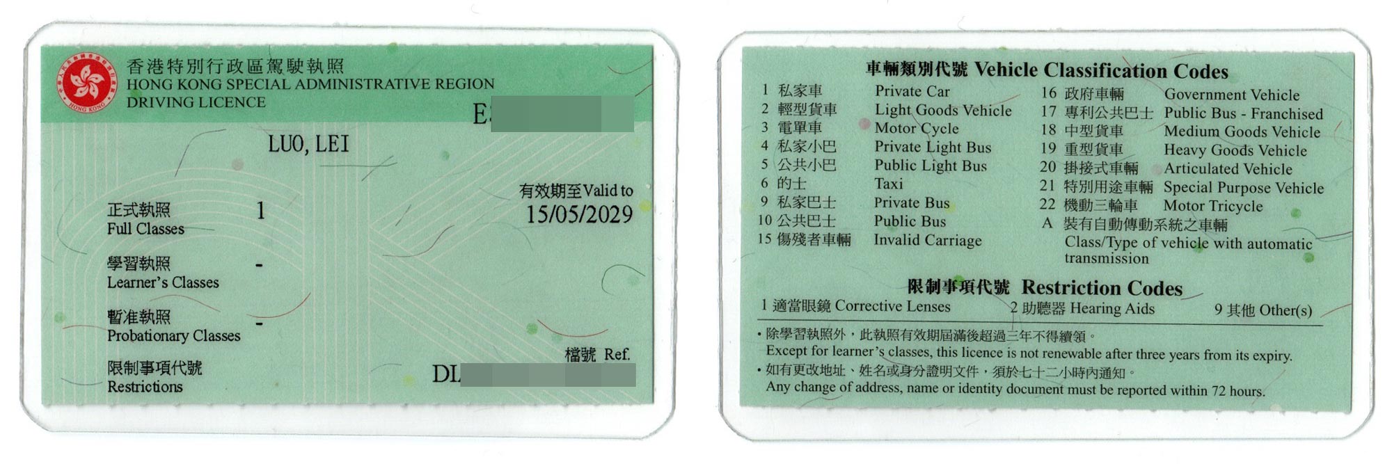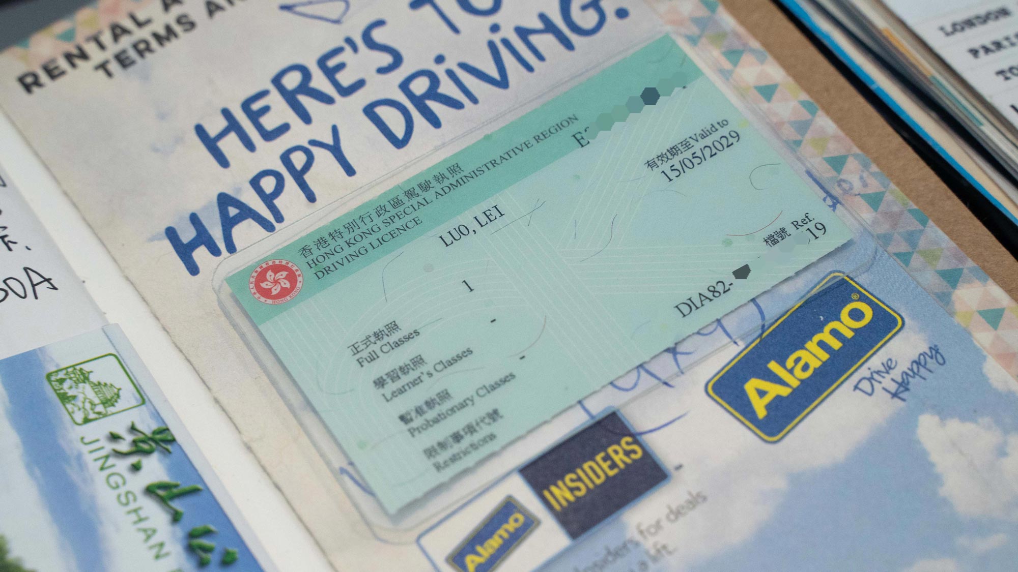 证件上有拼音姓名,右上角是我的护照号和驾照有效期,个人建议使用护照来申请香港驾照,毕竟如果是在国外旅游,万一需要出示证件,同时出示护照+香港驾照,证件号对得上,说不定能省点麻烦。